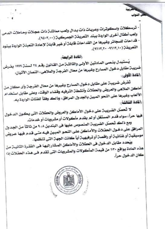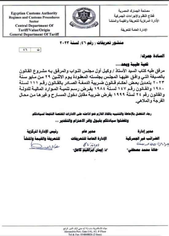أصدرت مصلحة الجمارك منشور التعريفات رقم (46) لسنة 2023 بخصوص كتاب وكيل أول مجلس النواب والمرفق به مشروع القانون بالصيغة التي وافق عليها المجلس بجلسته المعقودة يوم الاثنين ٢٩ من مايو سنة ۲۰۲۳ بتعديل بعض أحكام قانون ضريبة الدمغة الصادر بالقانون رقم 111 لسنة ۱۹۸۰ والقانون رقم ١٤٧ لسنة ۱۹۸٤ بفرض رسم تنمية الموارد المالية للدولة والقانون رقم ٢٤ لسنة ۱۹۹۹ بفرض ضريبة مقابل دخول المسارح وغيرها من محال الفرجة والملاهي.