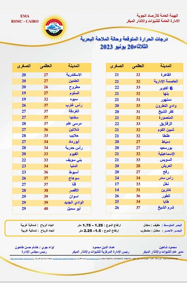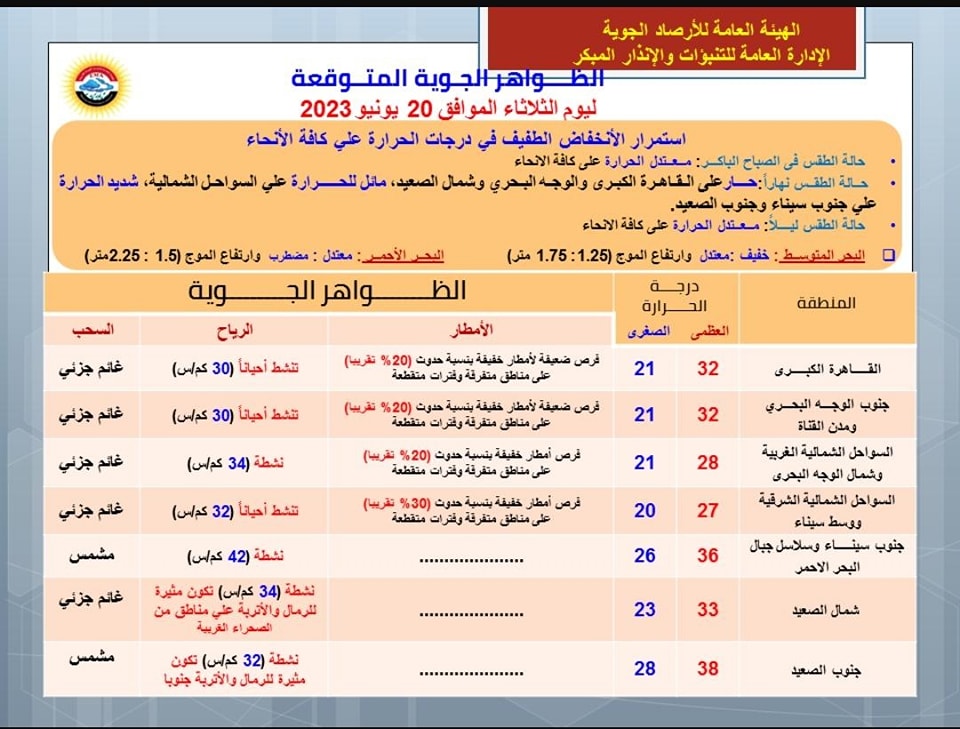 كما أعلنت هيئة الأرصاد الجوية حالة الطقس خلال الأيام المقبلة، حيث يسود طقس معتدل صباحًا، حار نهارًا على القاهرة الكبرى والوجه البحري وشمال الصعيد، مائل للدفء على السواحل الشمالية، شديد الحرارة على جنوب الصعيد وجنوب الصعيد، معتدل ليلًا.