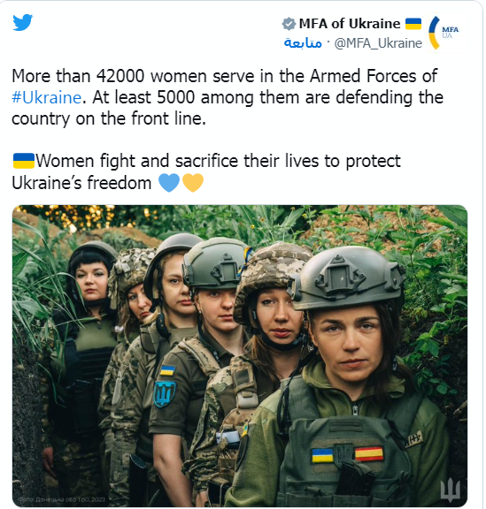 وقالت وزارة الخارجية الأوكرانية في منشور على تويتر، الاثنين، إن "أكثر من 42000 امرأة تخدم في القوات المسلحة لأوكرانيا".