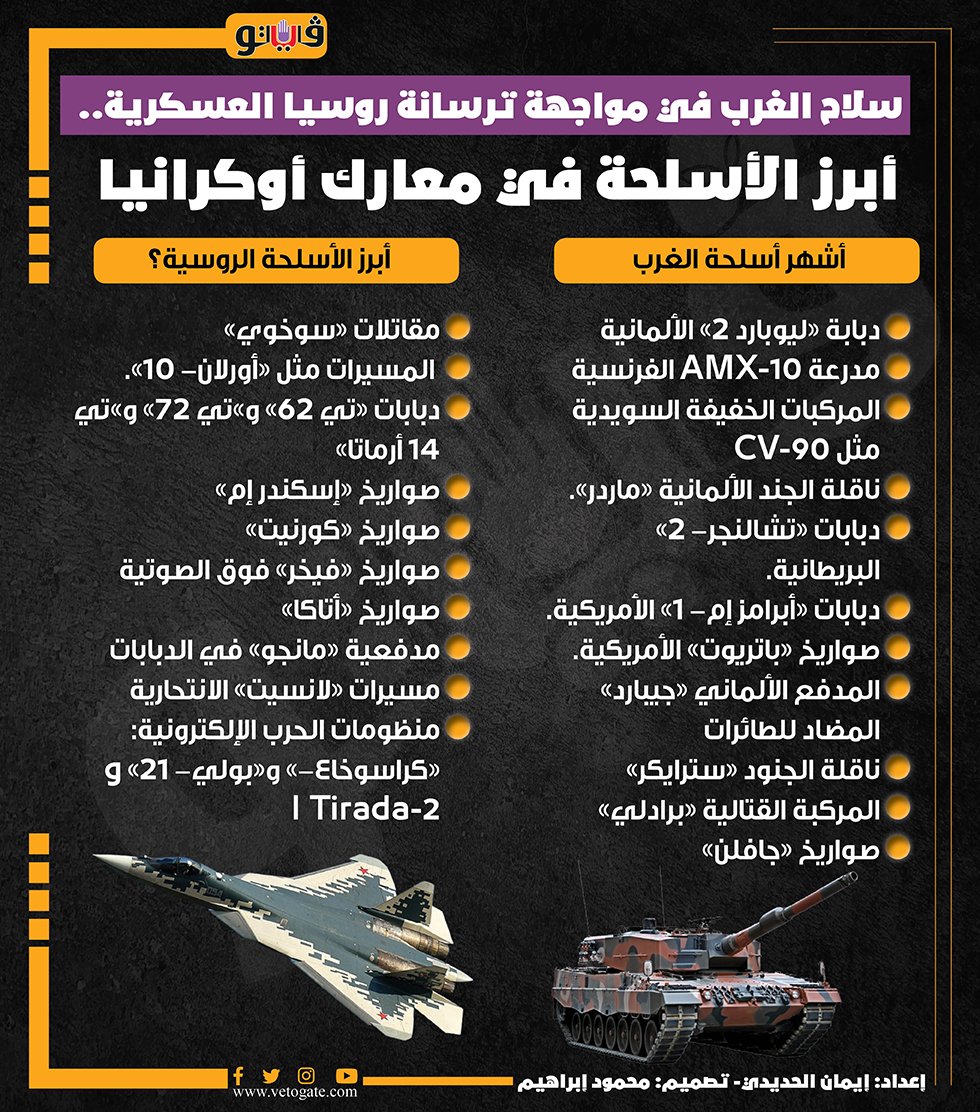 سلاح الغرب في مواجهة ترسانة روسيا العسكرية.. أبرز الأسلحة في معارك أوكرانيا (إنفوجراف) الأربعاء 21/يونيو/2023 - 03:01 م 6/21/2023 3:01:01 PM الاسلحة المستخدمة في حرب روسيا اوكرانيا، فيتو إيمان الحديدى شارك طباعة 18 حجم الخط شارك طباعة الأسلحة الروسية السويد دبابة ليوبارد باتريوت صواريخ باتريوت الأمريكية صواريخ باتريوت