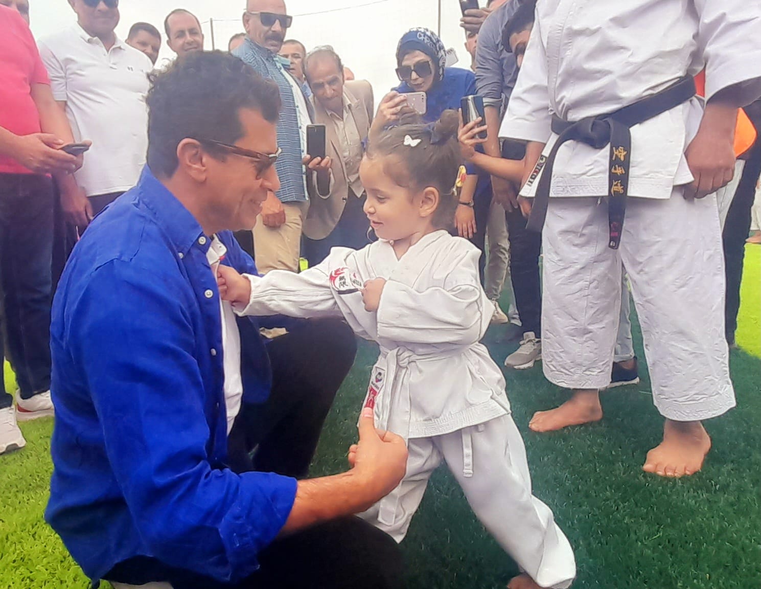 وتظهر الطفلة في الصورة وهي تطبق حركات الكاراتيه علي وزير الرياضة.