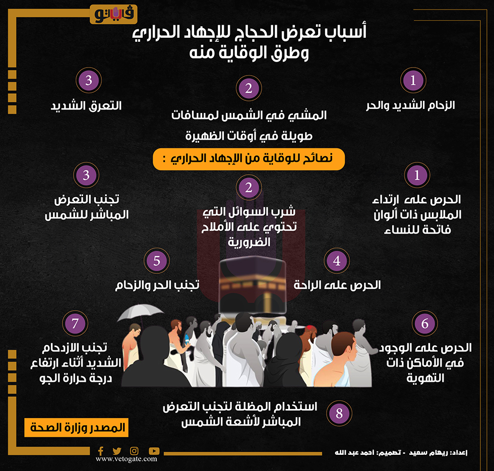أسباب تعرض الحجاج للإجهاد الحراري وطرق الوقاية منه (إنفوجراف) الأربعاء 21/يونيو/2023 - 07:21 م 6/21/2023 7:21:03 PM موسم الحج ٢٠٢٣ ريهام سعيد شارك طباعة 18 حجم الخط شارك طباعة اسباب الإجهاد الإجهاد الحراري التعرض المباشر لأشعة الشمس الزحام الشديد وزارة الصحة