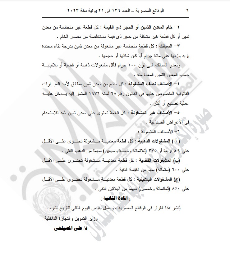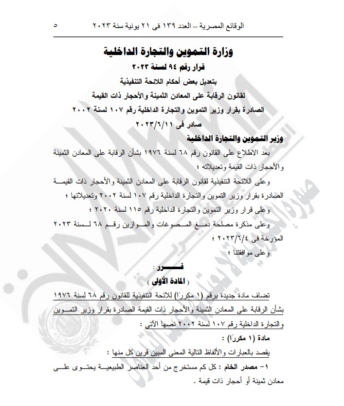 نشرت جريدة الوقائع المصرية في عددها رقم 139، الصادر في 21 يونية 2023، قرار وزارة التموين والتجارة الداخلية رقم ٩٤ لسنة ٢٠٢٣، بشأن تعديل بعض أحكام اللائحة التنفيذية لقانون الرقابة على المعادن الثمينة والأحجار ذات القيمة الصادرة بقرار وزير التموين والتجارة الداخلية رقم ١٠٧ لسنة ٢٠٠٢.