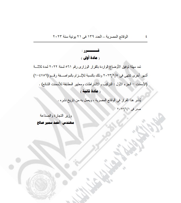 وجاء في نص المادة الأولى للقرار "تمد مهلة توفيق الأوضاع الواردة بالقرار الوزارى رقم ٥٦١ لسنة ٢٠٢٢ لمدة ثلاثة أشهر أخرى تنتهى فى ٥/٩/٢٠٢٣ وذلك بالنسبة للإلزام بالمواصفة رقـم (٤٧٥٦-١) (الأسمنت- الجزء الأول: التركيب والاشتراطات ومعايير المطابقة للأسمنت الشائع).
