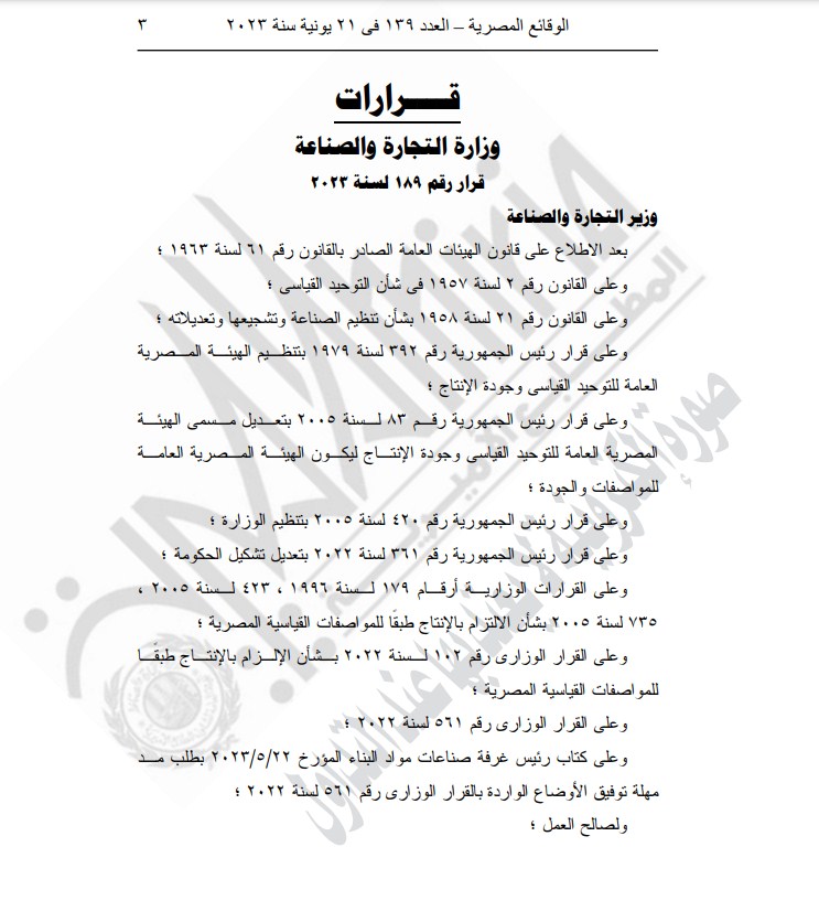 نشرت جريدة الوقائع المصرية في عددها رقم 139، الصادر في 21 يونيو 2023، قرار وزارة التجارة والصناعة رقم ١٨٩ لسنة ٢٠٢٣، بشأن مد مهلة توفيق أوضاع المنتجين والمستوردين للأسمنت مدة 3 أشهر لتوفيق أوضاعهم.