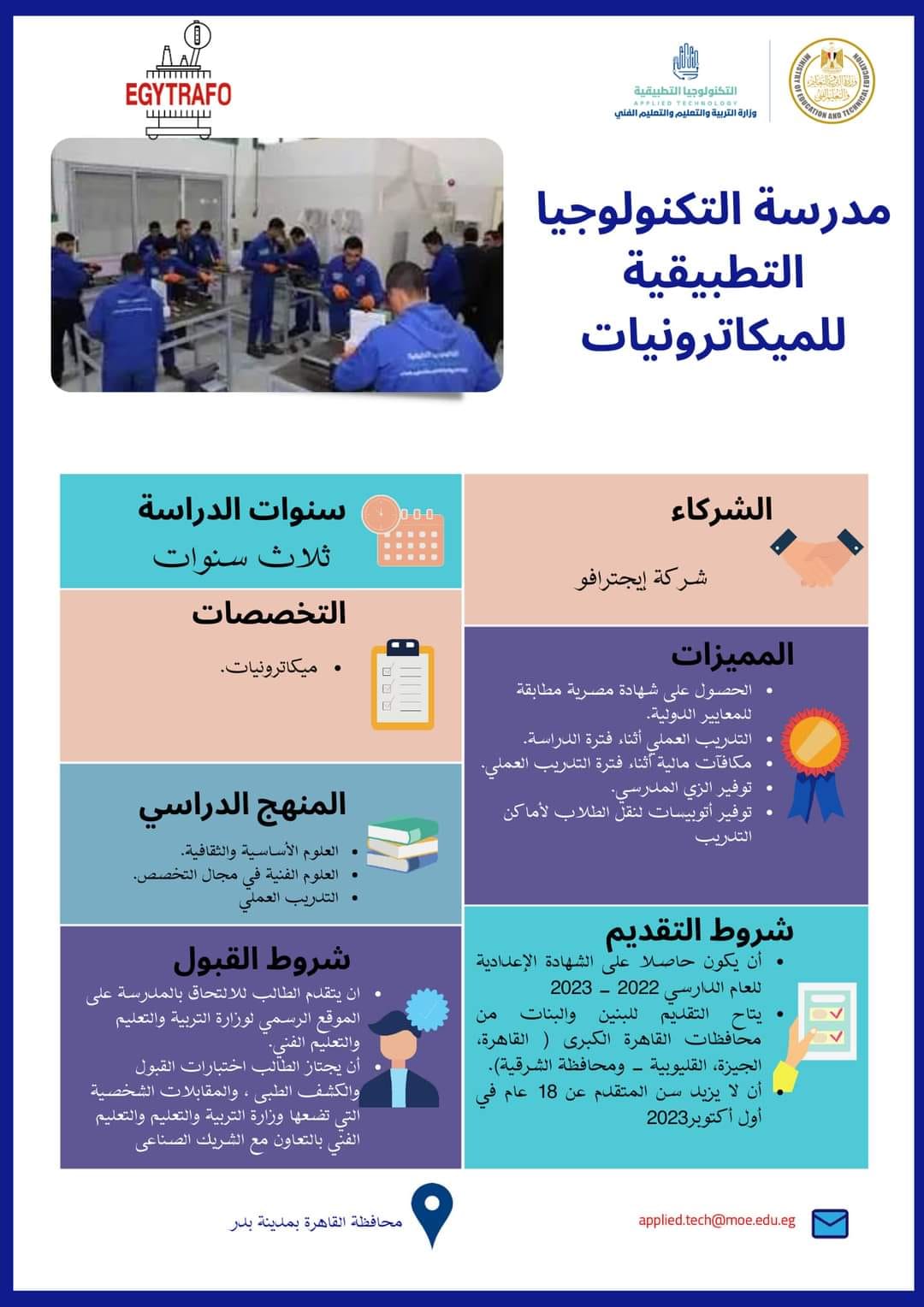 ويمكن لطلاب الشهادة الإعدادية 2023، الالتحاق بـ مدرسة التكنولوجيا التطبيقية للميكاترونيات وفقا لشروط الالتحاق وهي كالتالي: