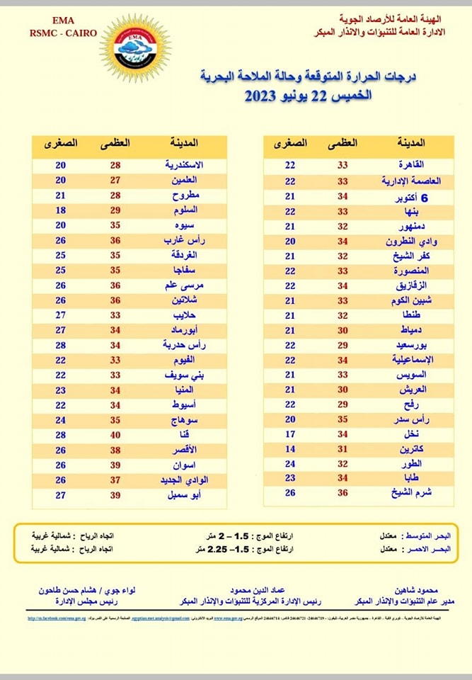 كما نشرت هيئة الأرصاد بيان بدرجات الحرارة المتوقعة اليوم الخميس والتي جاءت كالتالي: