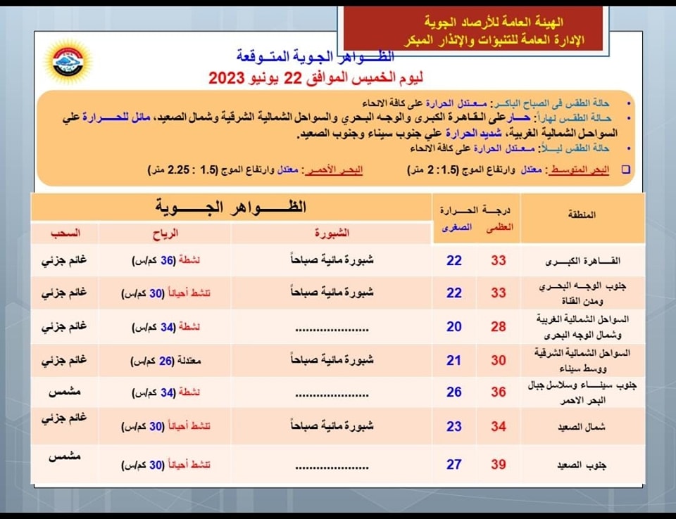 كما أعلنت هيئة الأرصاد الجوية حالة الطقس خلال الأيام المقبلة، حيث يسود طقس معتدل صباحا، حار نهارًا على القاهرة الكبرى والوجه البحري وشمال الصعيد، مائل للدفء على السواحل الشمالية، شديد الحرارة على جنوب الصعيد وجنوب الصعيد، معتدل ليلًا.