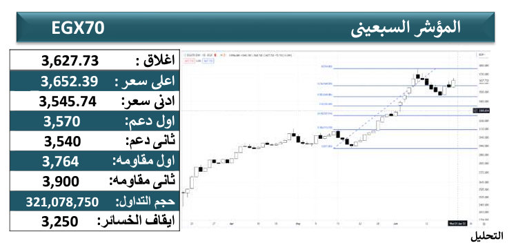 وأغلق مؤشر EGX 70 بجلسة أمس على وتيرة ايجابية عند 3627 نقطة كما شهد المؤشر ارتفاعا بعد محاولة اختبار مستويات صاعدة ومن ثم فى حالة حدوث انخفاض مؤقت من المستويات الحالية فسوف يتم تكوين قمة جديدة عند 3700 نقطة ليدفع المؤشر على الانخفاض واستهداف مستويات هابطة بالقرب من منطقة الدعم التى تكمن عند 3540 – 3570 نقطة.