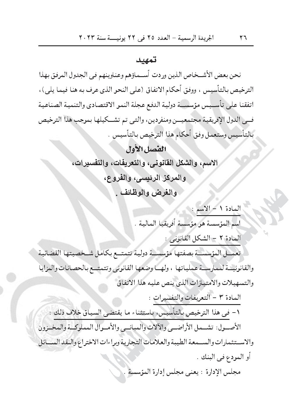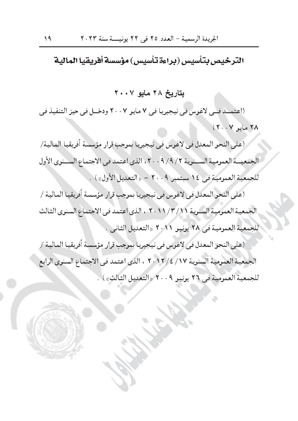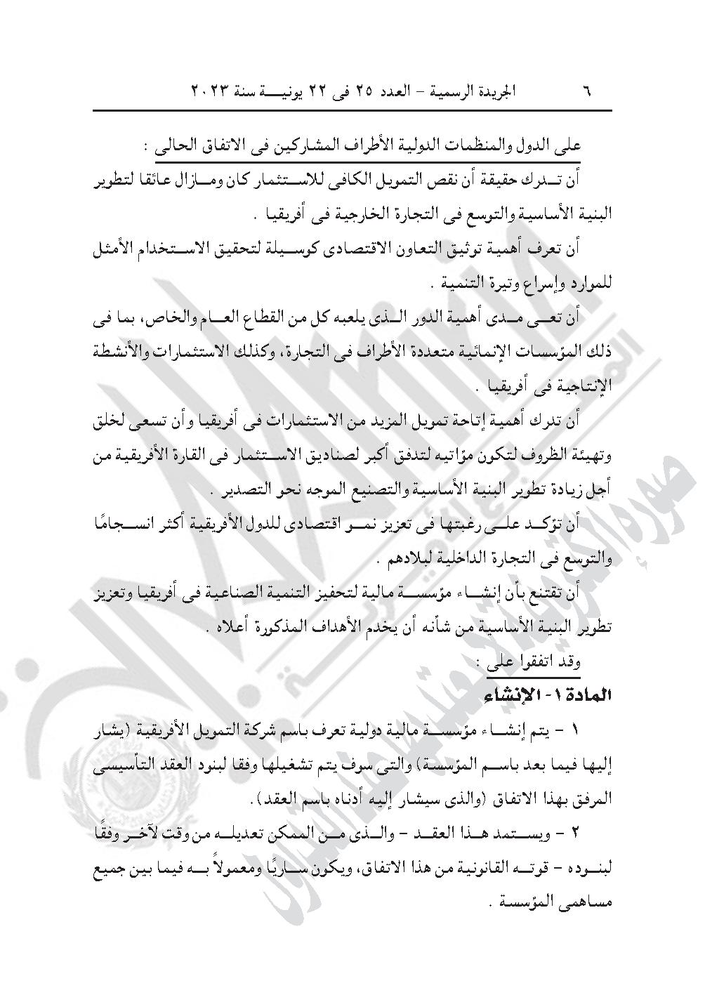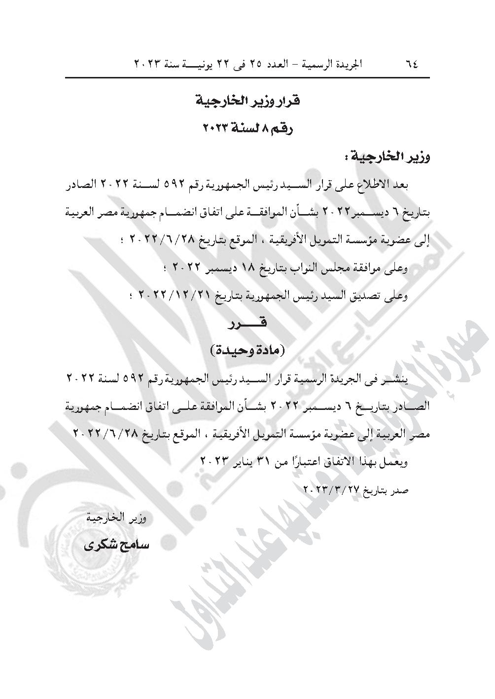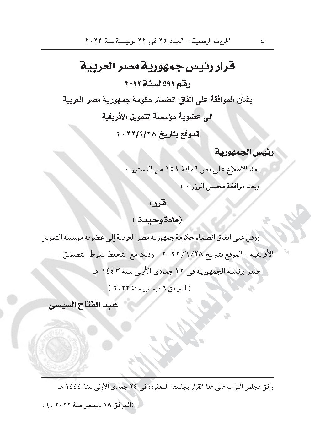 نشرت الجريدة الرسمية في عددها رقم 25، الصادر في 22 يونية 2023، قرارا جمهوريا جديدا لرئيس الجمهورية عبد الفتاح السيسي، رقم 592 لسنة 2022، بشأن الموافقة على اتفاق انضمام حكومة جمهورية مصر العربية إلى عضوية مؤسسة التمويل الأفريقية.
