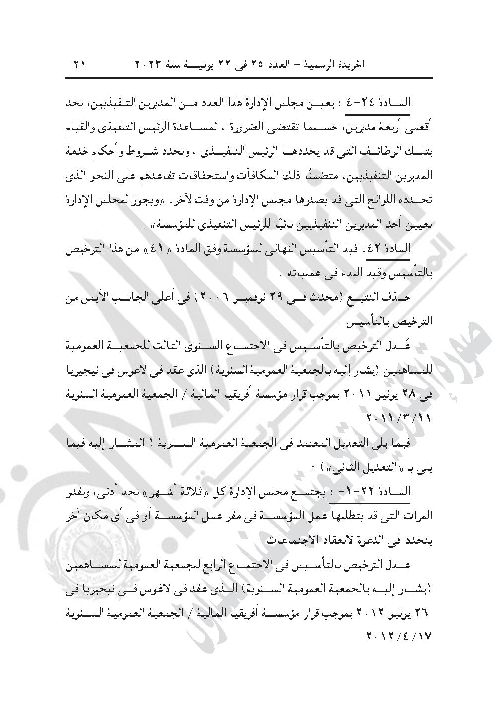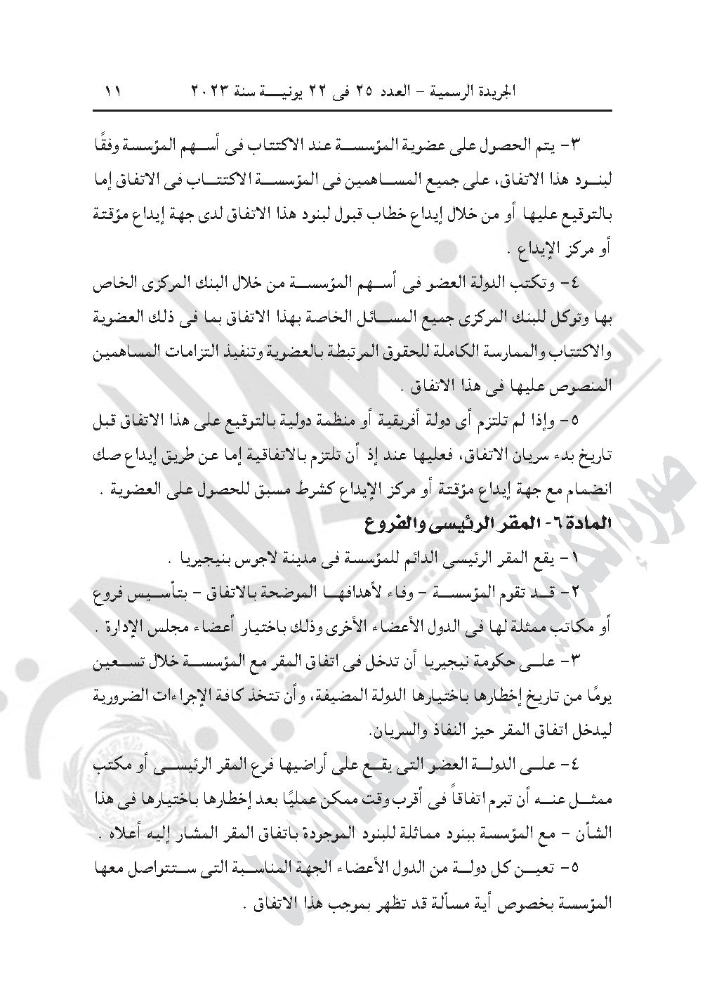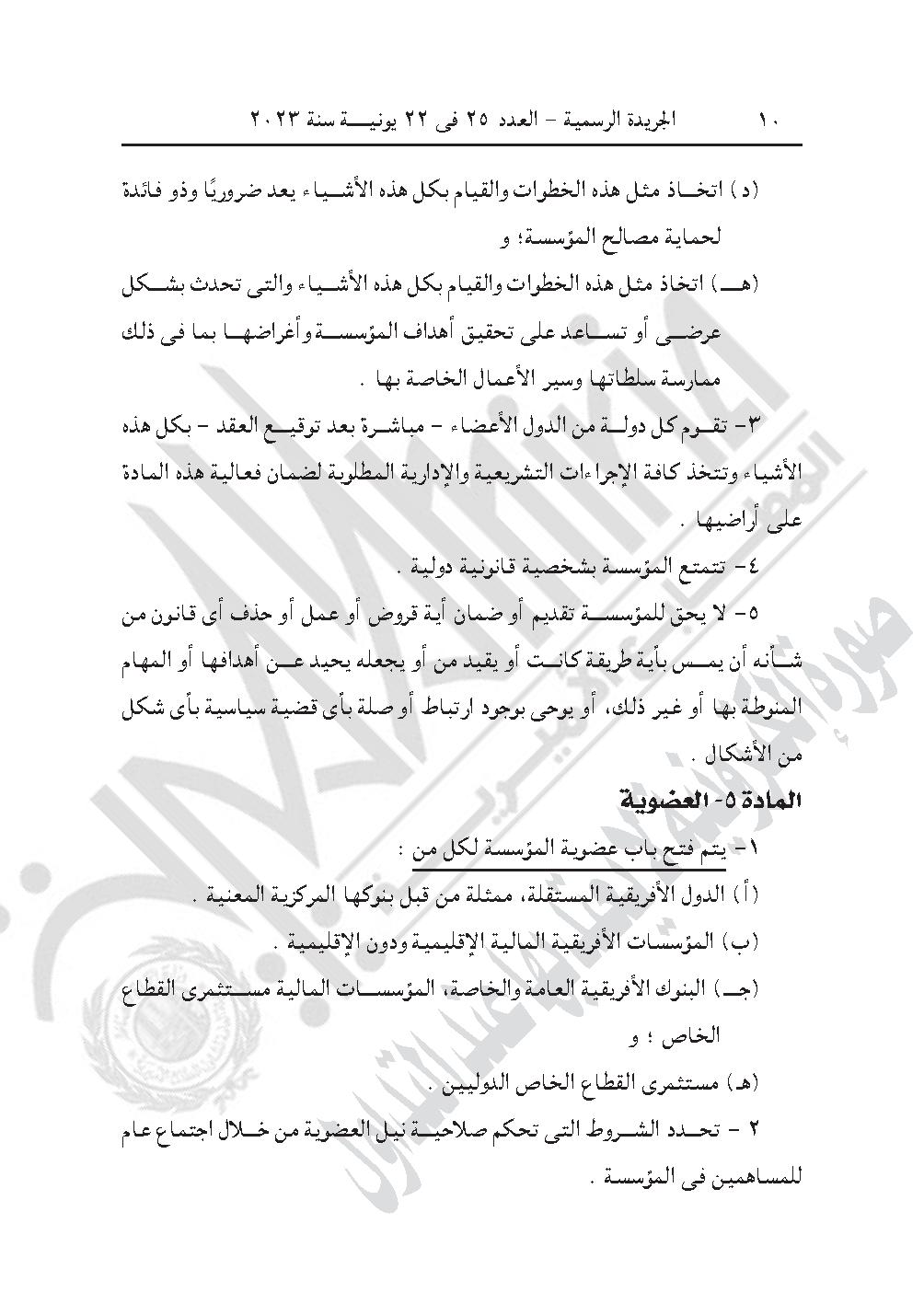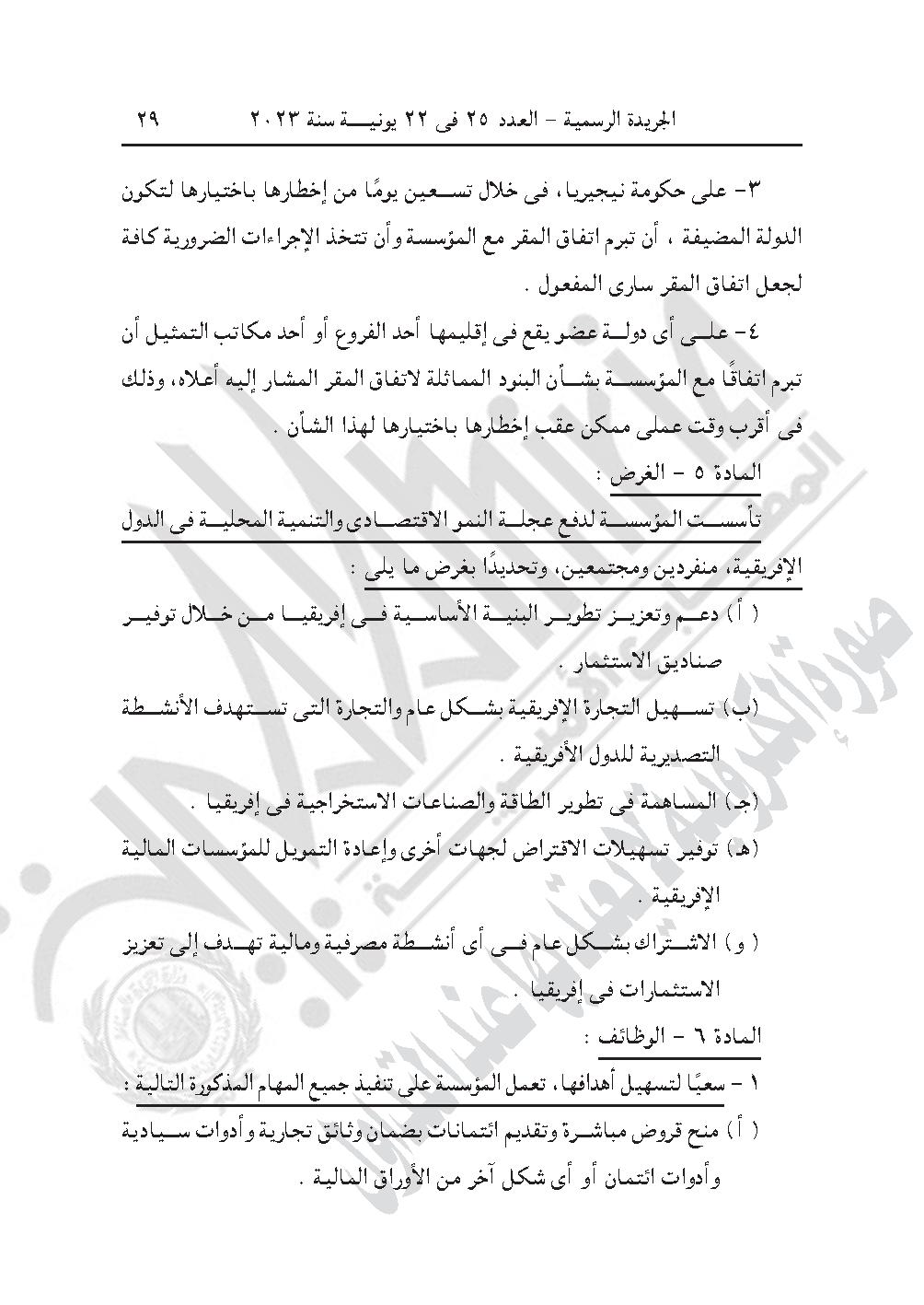 نشرت الجريدة الرسمية في عددها رقم 25، الصادر في 22 يونية 2023، قرارا جمهوريا جديدا لرئيس الجمهورية عبد الفتاح السيسي، رقم 592 لسنة 2022، بشأن الموافقة على اتفاق انضمام حكومة جمهورية مصر العربية إلى عضوية مؤسسة التمويل الأفريقية.