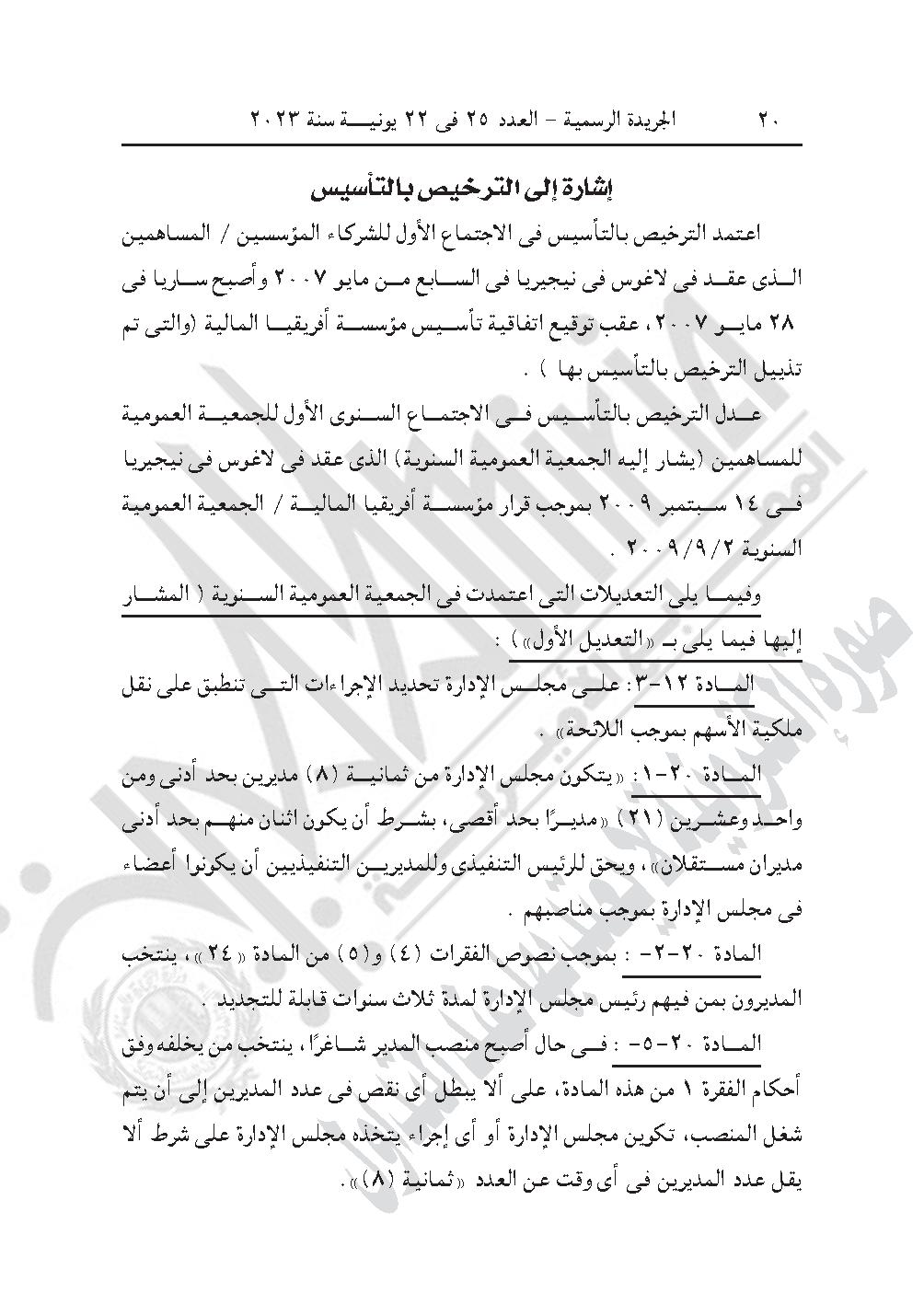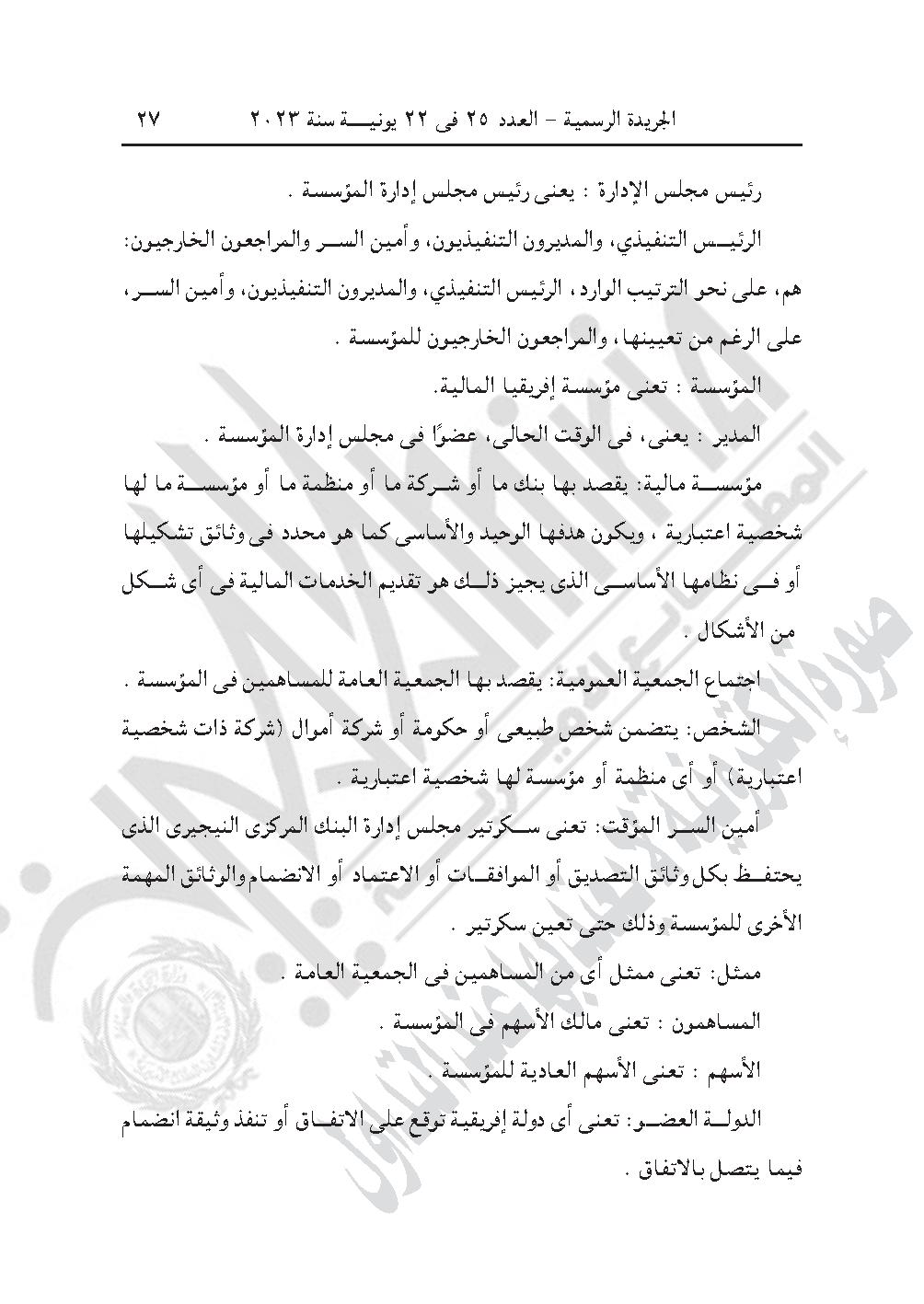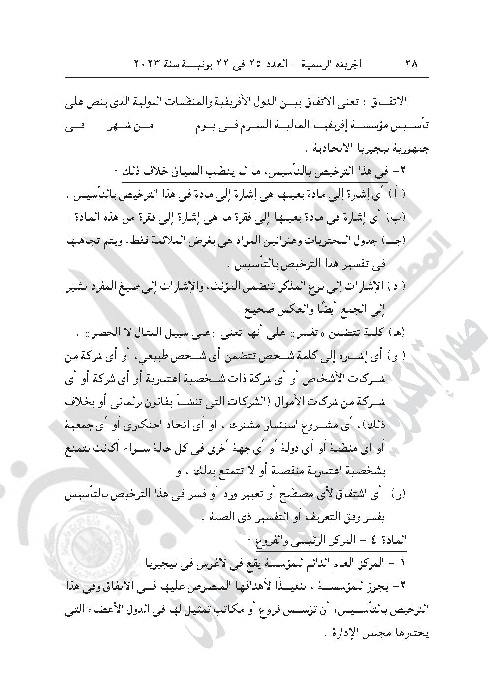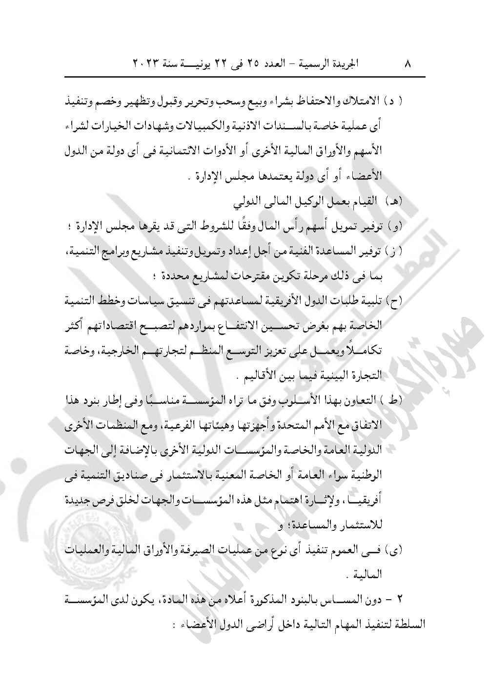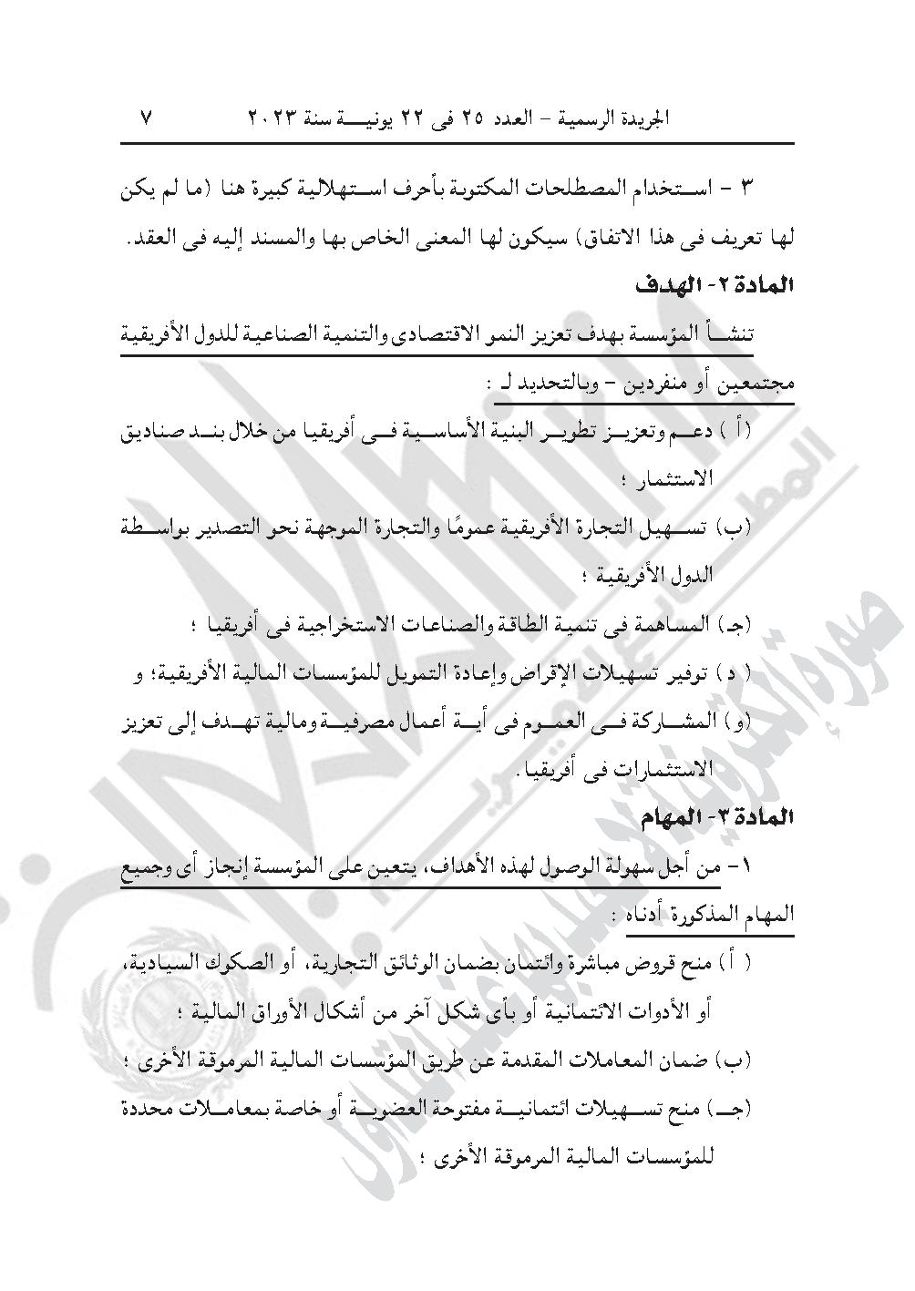 نشرت الجريدة الرسمية في عددها رقم 25، الصادر في 22 يونية 2023، قرارا جمهوريا جديدا لرئيس الجمهورية عبد الفتاح السيسي، رقم 592 لسنة 2022، بشأن الموافقة على اتفاق انضمام حكومة جمهورية مصر العربية إلى عضوية مؤسسة التمويل الأفريقية.