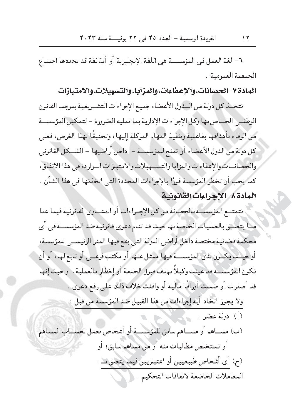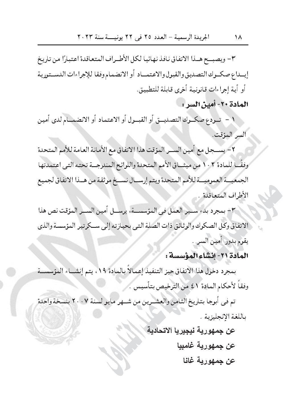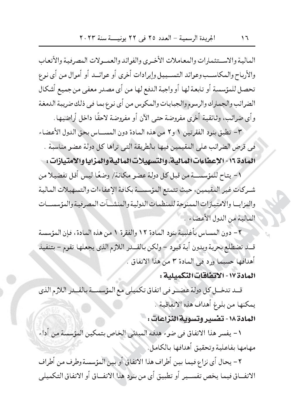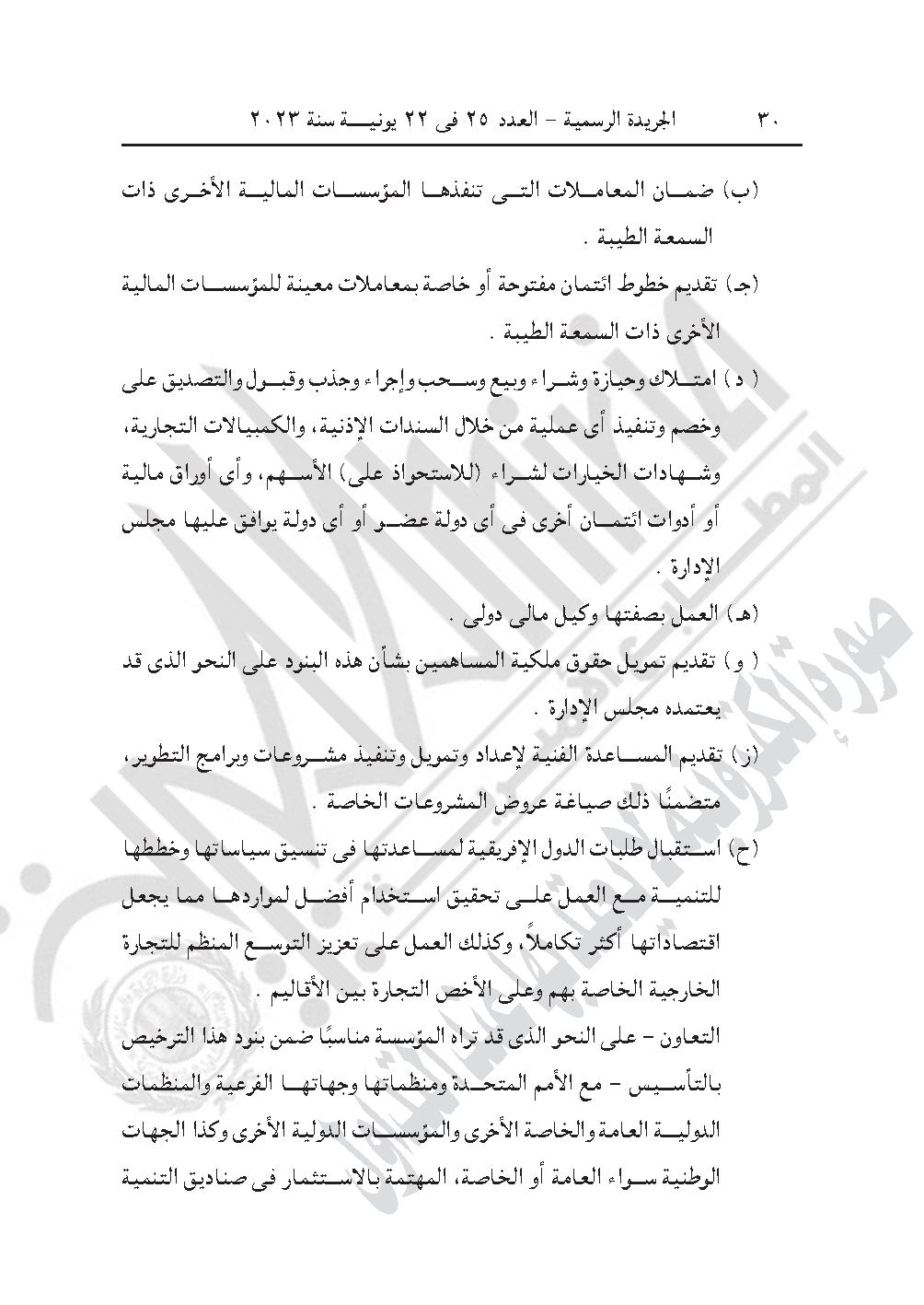 نشرت الجريدة الرسمية في عددها رقم 25، الصادر في 22 يونية 2023، قرارا جمهوريا جديدا لرئيس الجمهورية عبد الفتاح السيسي، رقم 592 لسنة 2022، بشأن الموافقة على اتفاق انضمام حكومة جمهورية مصر العربية إلى عضوية مؤسسة التمويل الأفريقية.