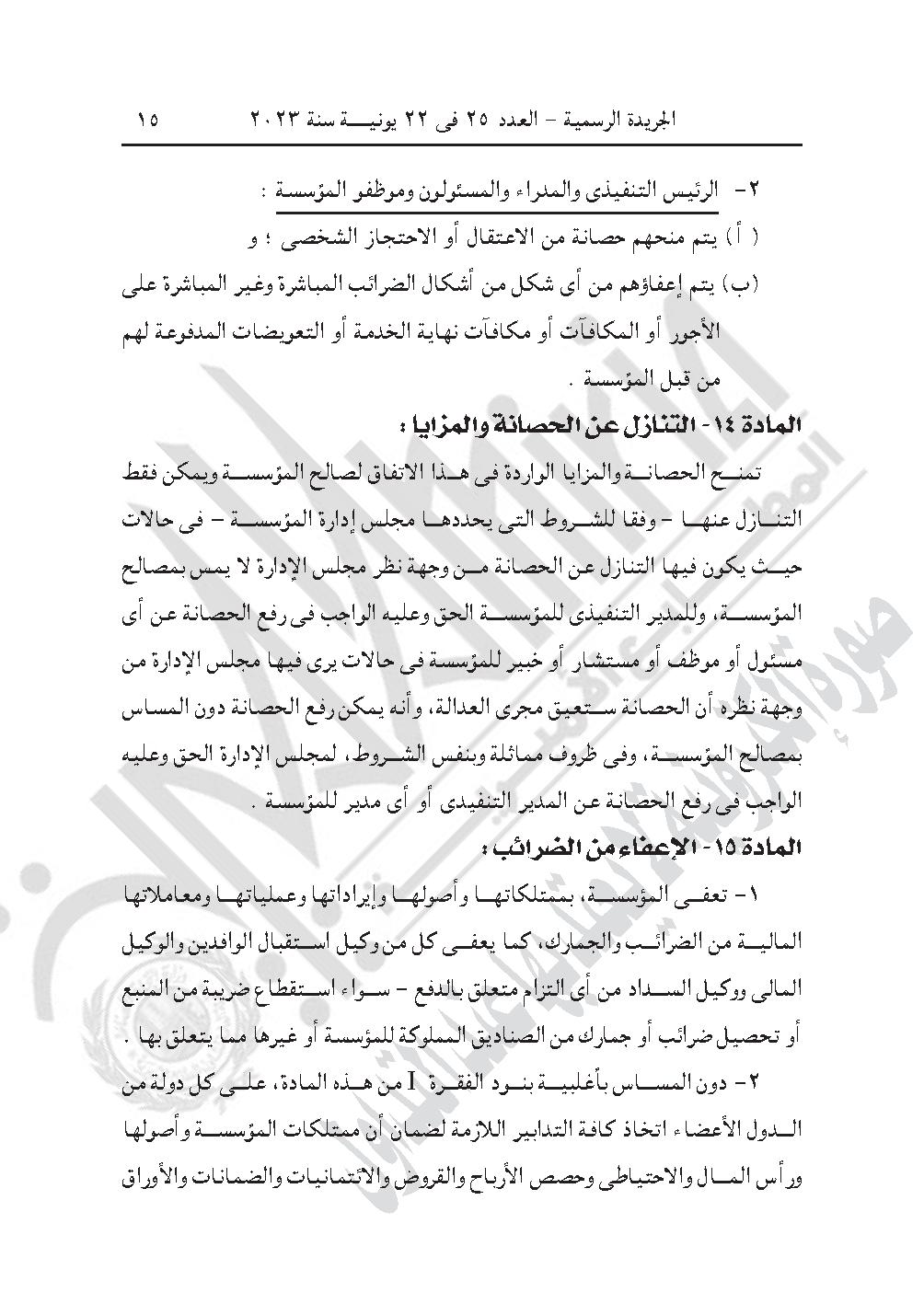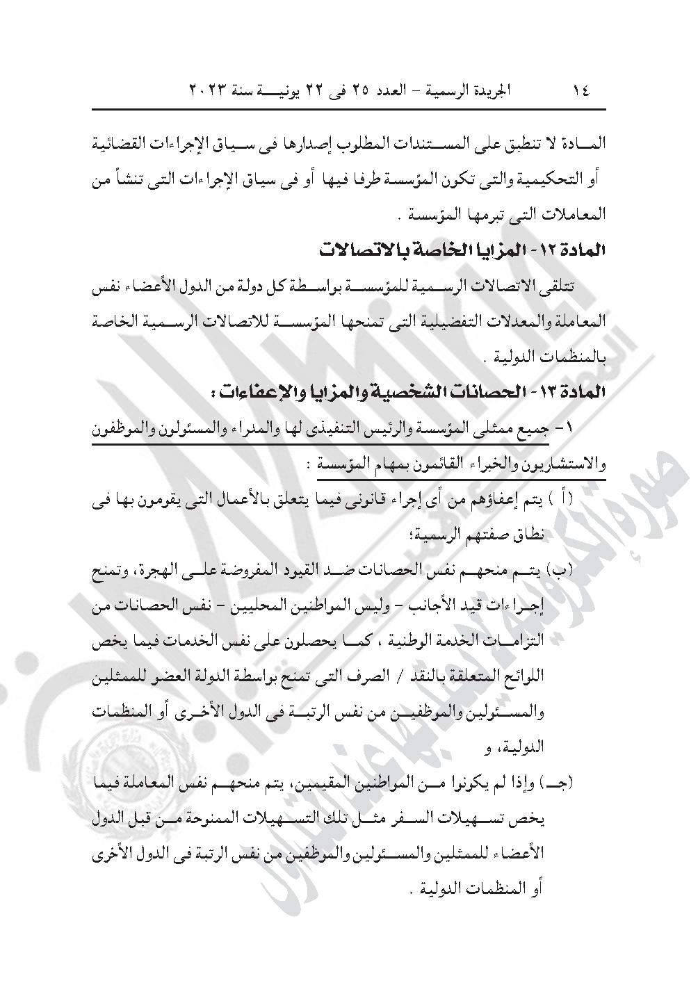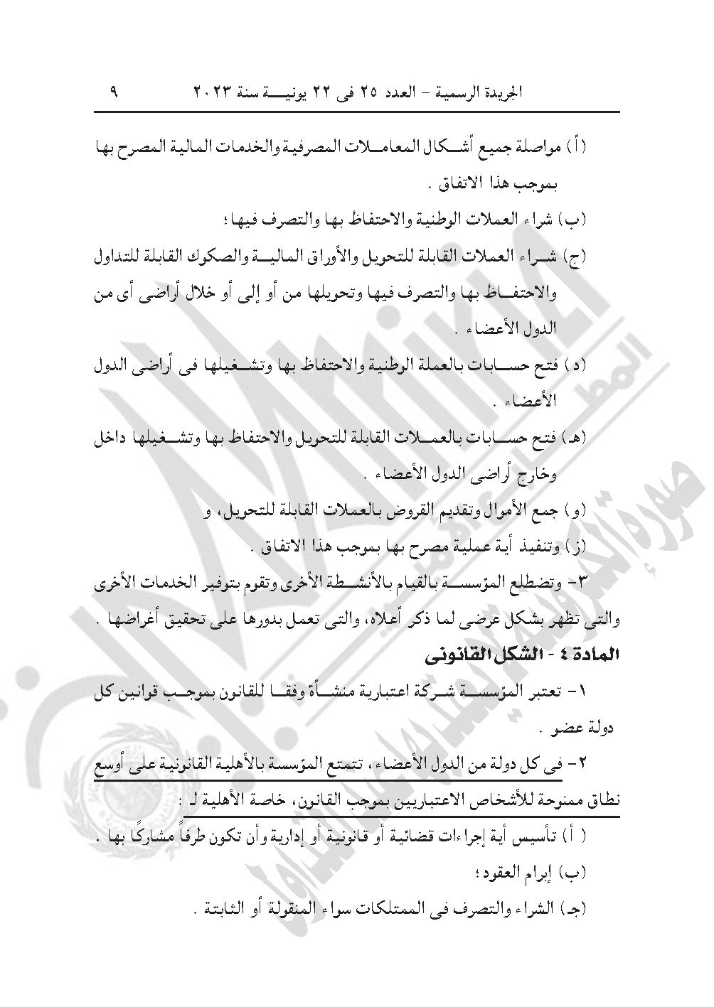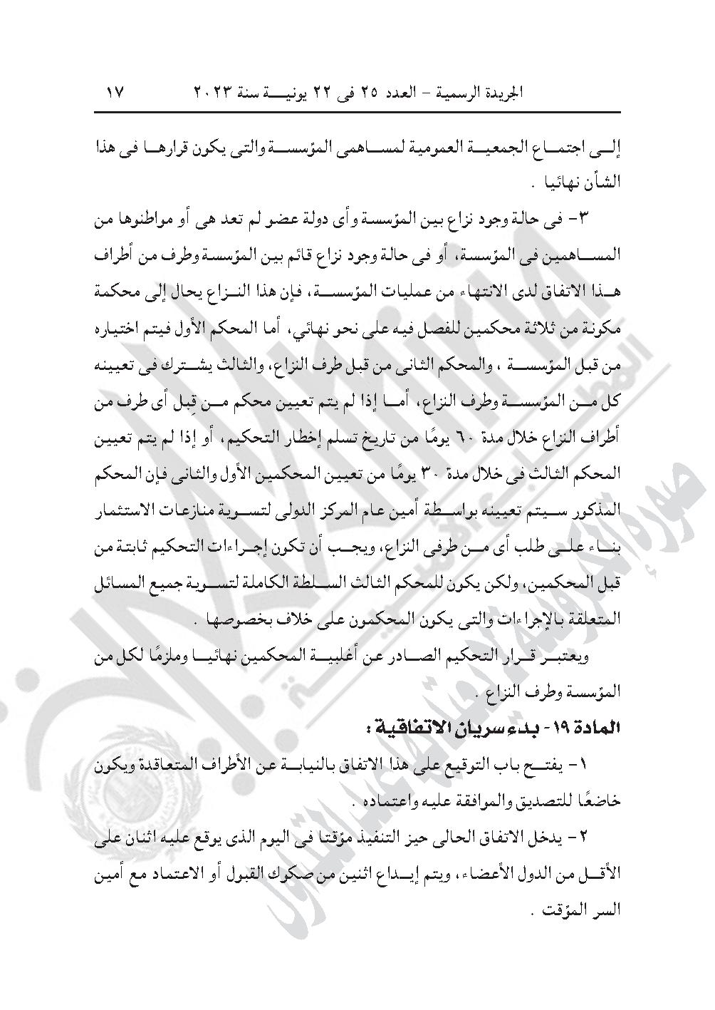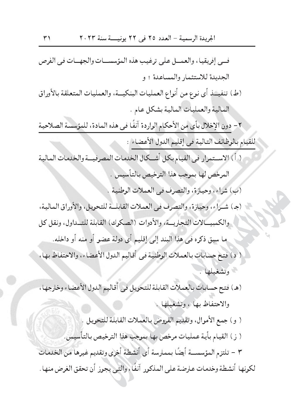 نشرت الجريدة الرسمية في عددها رقم 25، الصادر في 22 يونية 2023، قرارا جمهوريا جديدا لرئيس الجمهورية عبد الفتاح السيسي، رقم 592 لسنة 2022، بشأن الموافقة على اتفاق انضمام حكومة جمهورية مصر العربية إلى عضوية مؤسسة التمويل الأفريقية.