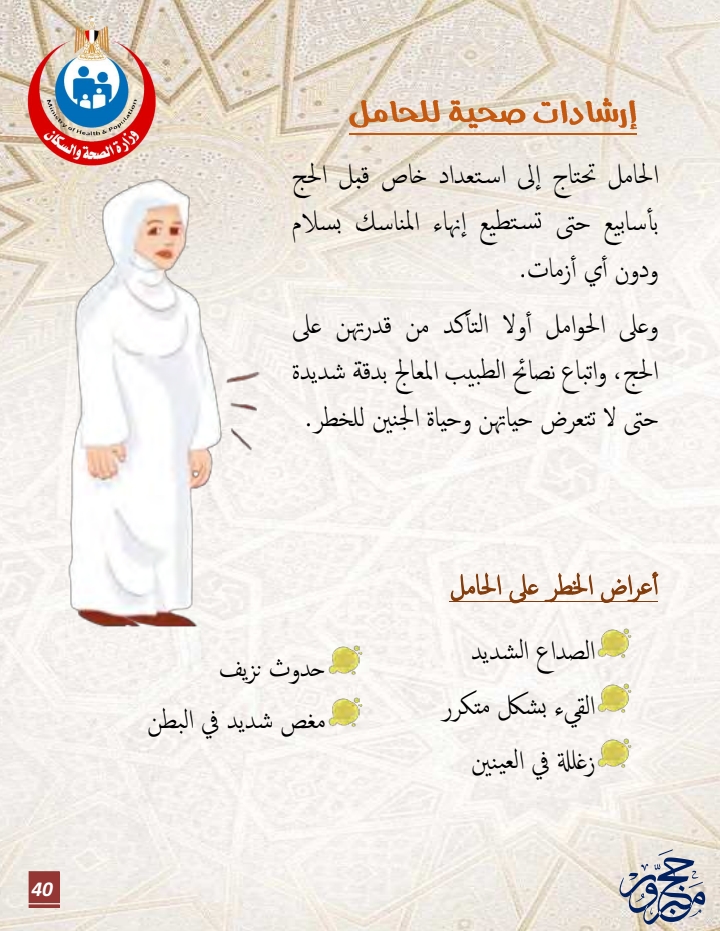وشددت وزارة الصحة أنه على الحوامل أولا التأكد من قدرتهن على الحج، واتباع نصائح الطبيب المعالج بدقة شديدة حتى لا تتعرض حياتهن وحياة الجنين للخطر.
