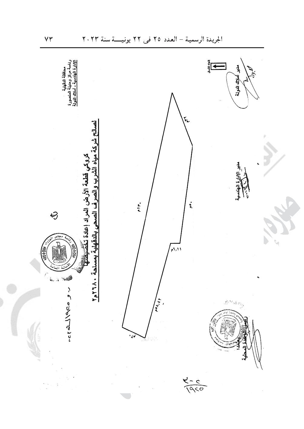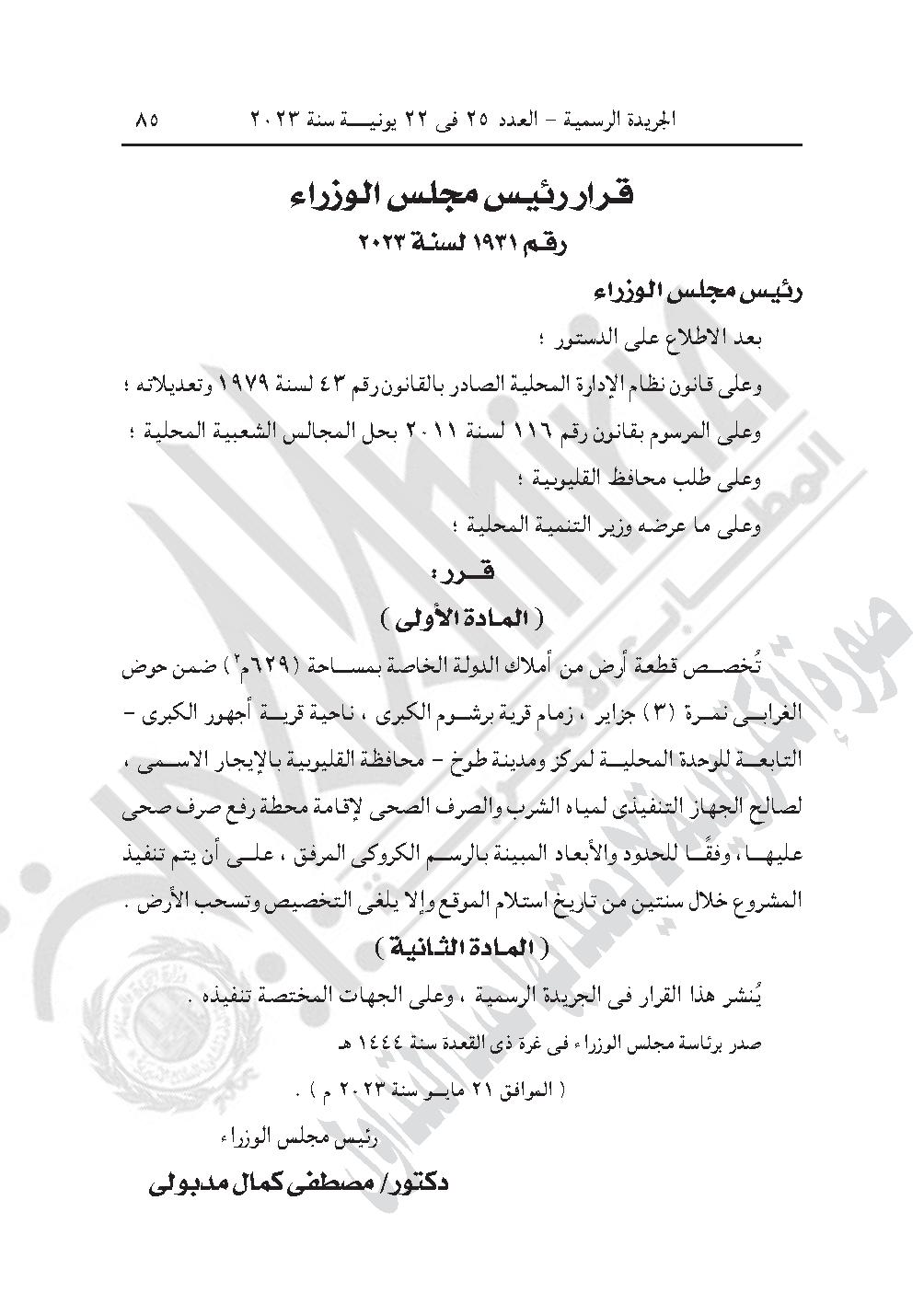 -وقرار رئيس الوزراء رقم 1931 لسنة 2023، بتخصيص قطعة أرض من أمالك الدولة الخاصة بمساحة 629 متر مربع، لصالح الجهاز التنفيذى لمياه الشرب والصرف الصحى.