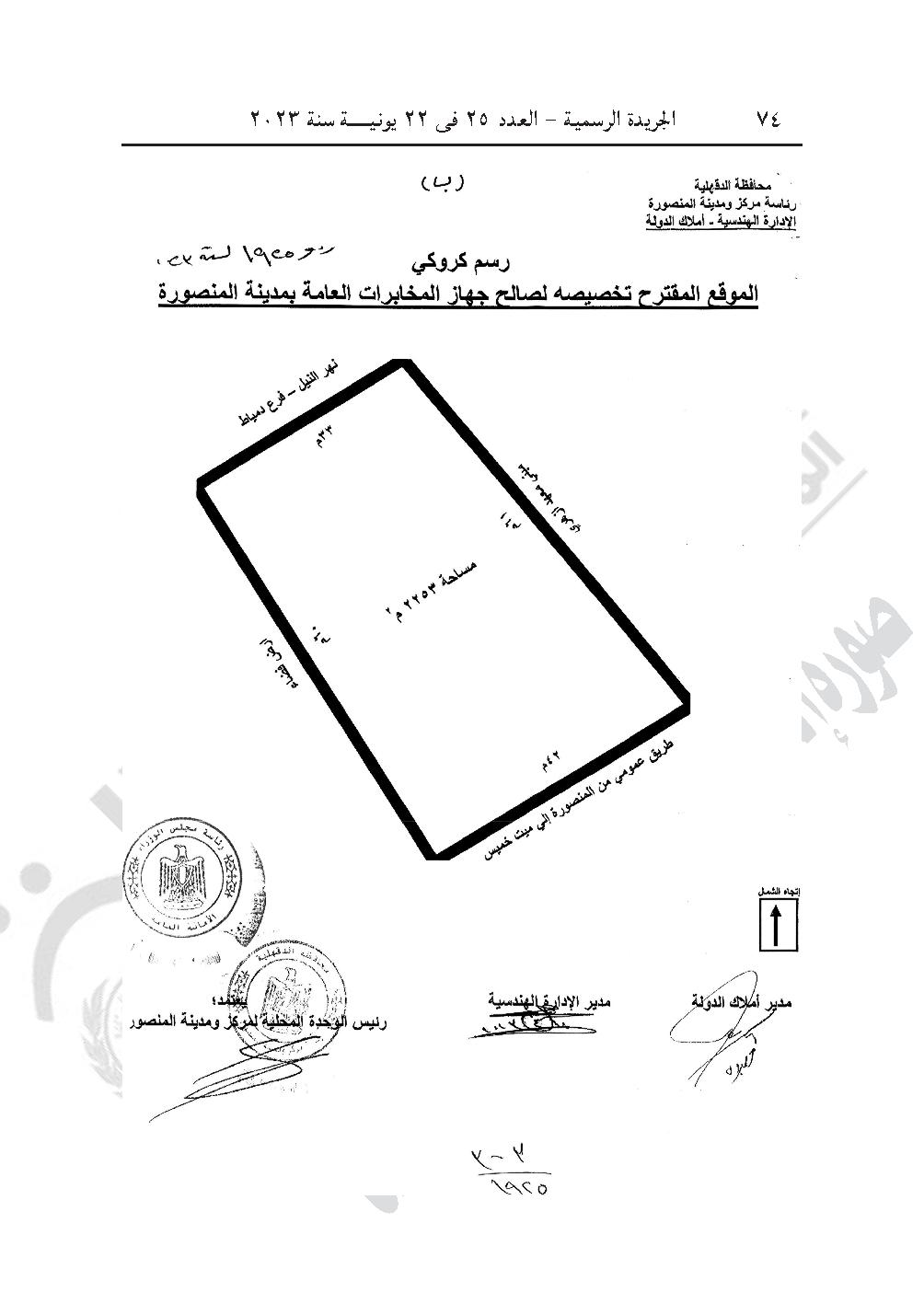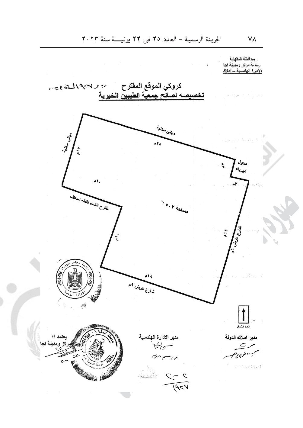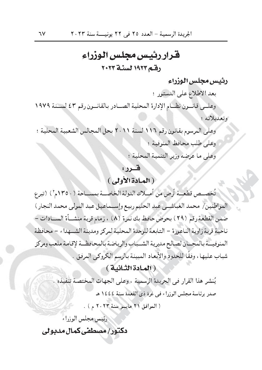 -قرار رئيس الوزراء رقم 1930 لسنة 2023 بتخصيص قطعة أرض من أملاك الدولة الخاصة بمساحة 1511 مترا مربعا، بالمجان، لصالح مديرية الشباب والرياضة بالمحافظة لإقامة ملعب خماسى منجل عليها.
