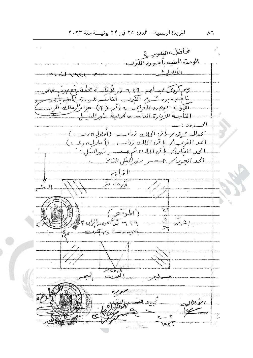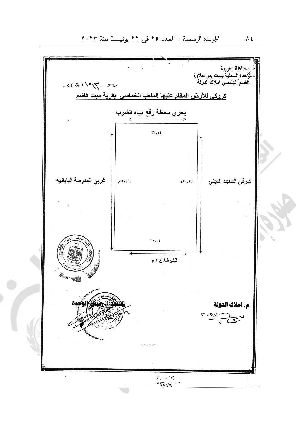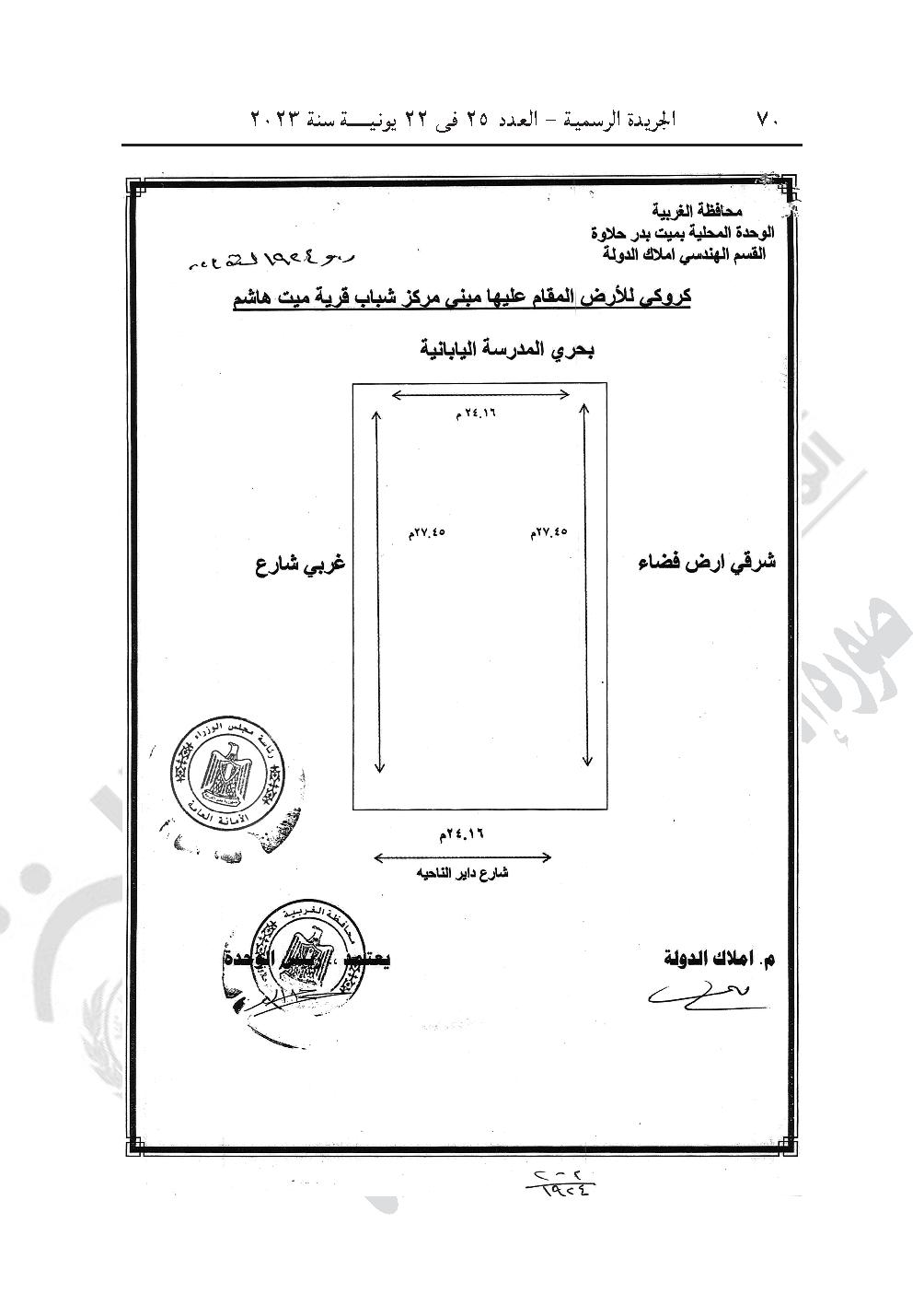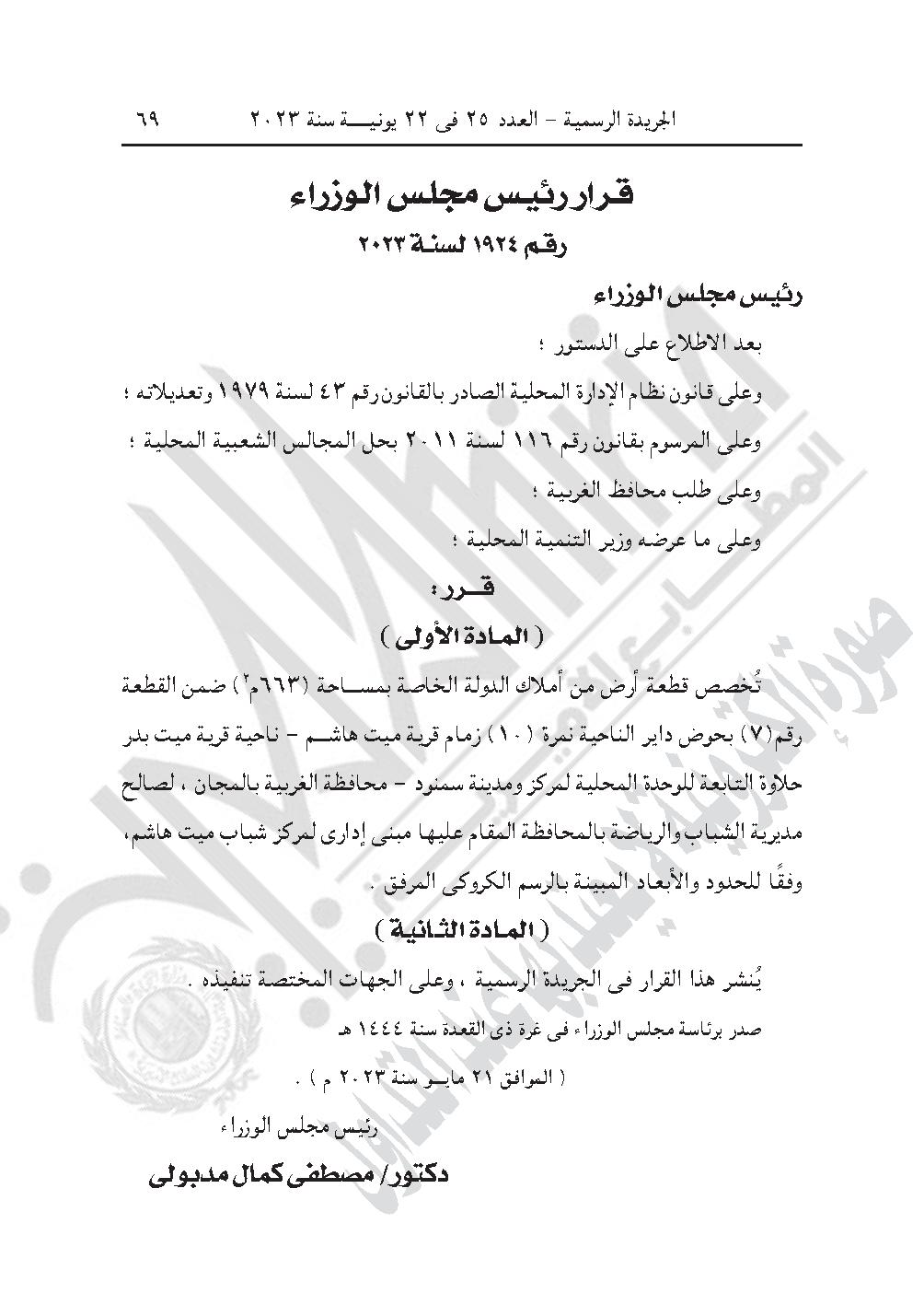 -قرار رئيس الوزراء رقم 1924 لسنة 2023، بتخصيص قطعة أرض من أملاك الدولة الخاصة بمساحة 663 مترا مربعا، بالمجان، لصالح مديرية الشباب والرياضة بالمحافظة المقام عليها مبنى إدارى لمركز شباب ميت هاشم.