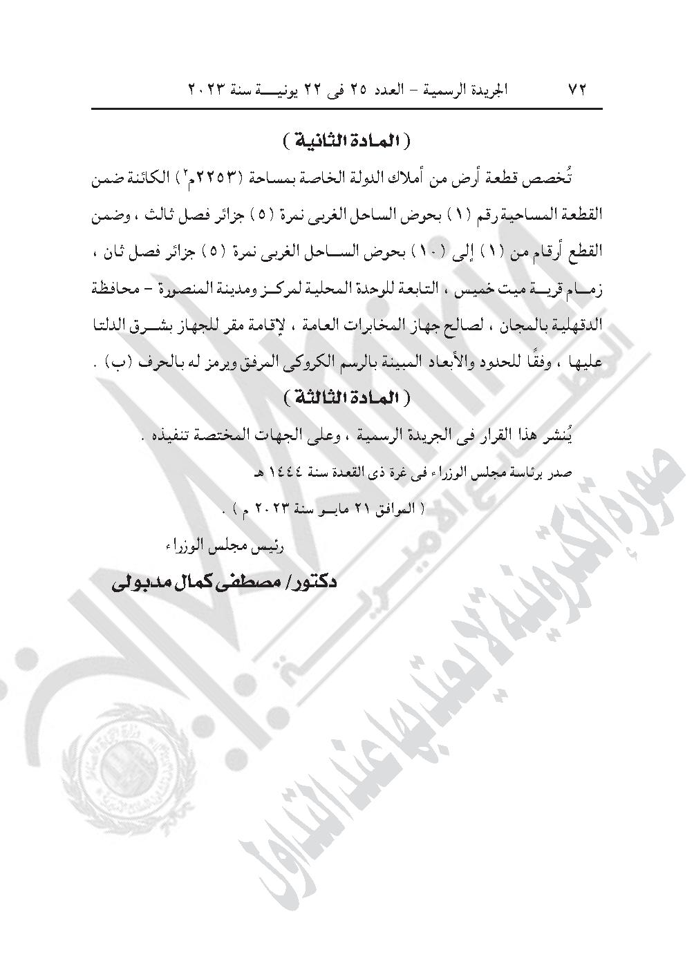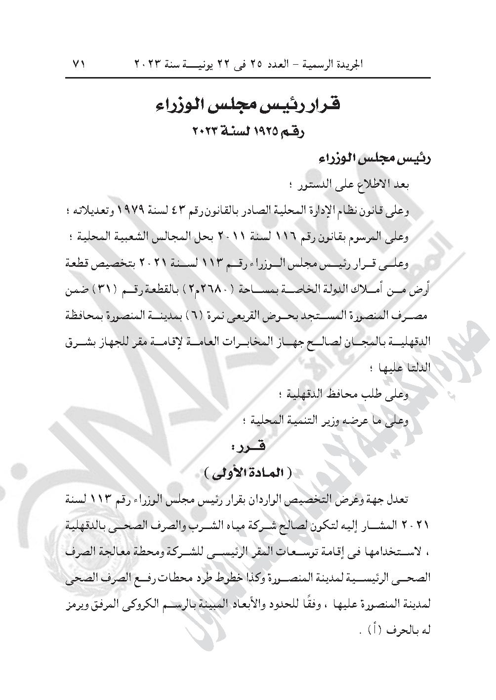 -قرار رئيس الوزراء رقم 1925 لسنة 2023، بتعديل جهة وغرض التخصيص الواردين بقرار رئيس مجلس الوزراء رقم 113 لسنة 2021 المشار إليه، لتكون لصالح شركة مياه الشرب والصرف الصحى بالدقهلية.