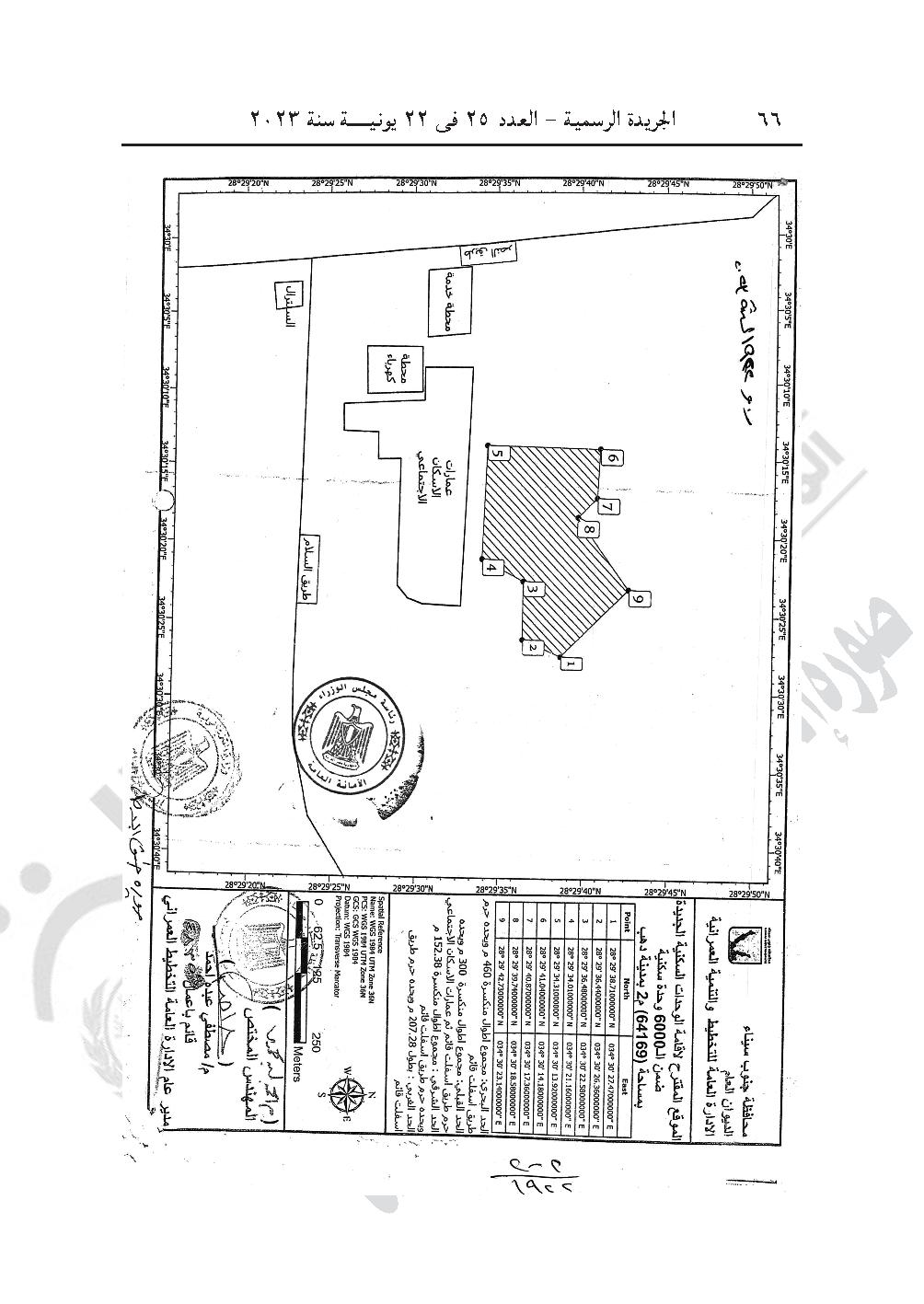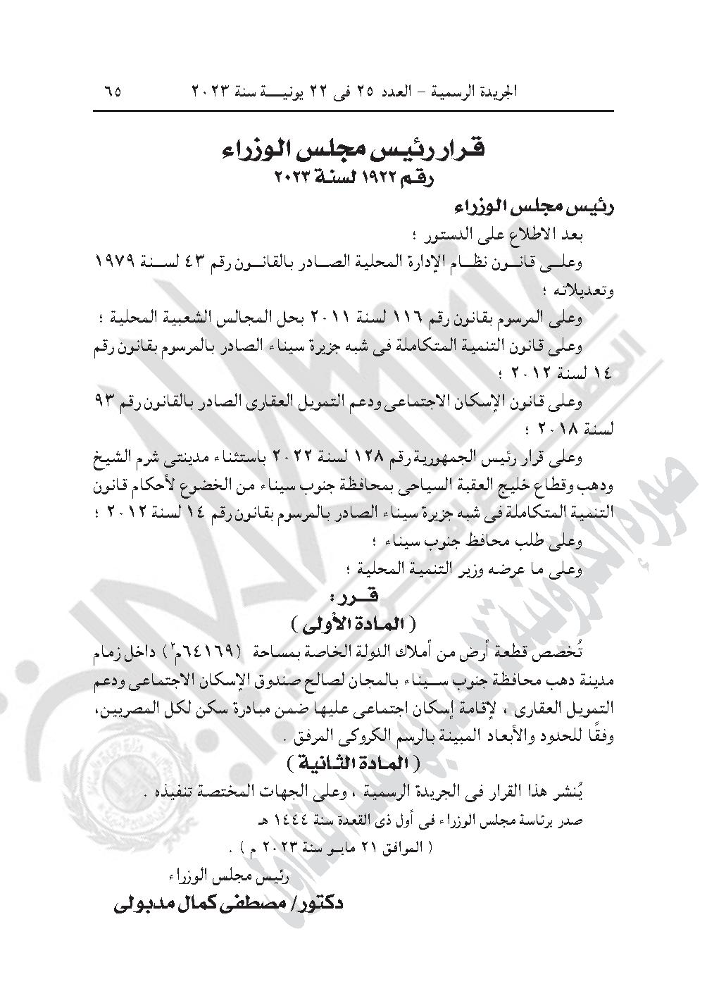 -قرار رئيس الوزراء رقم 1922 لسنة 2023، بتخصيص قطعة أرض من أملاك الدولة الخاصة بمساحة 64169 متر مربع، داخل زمام مدينة دهب محافظة جنوب سيناء، بالمجان، لصالح صندوق الإسكان الاجتماعى ودعم التمويل العقارى، لإقامة إسكان اجتماعى عليها.