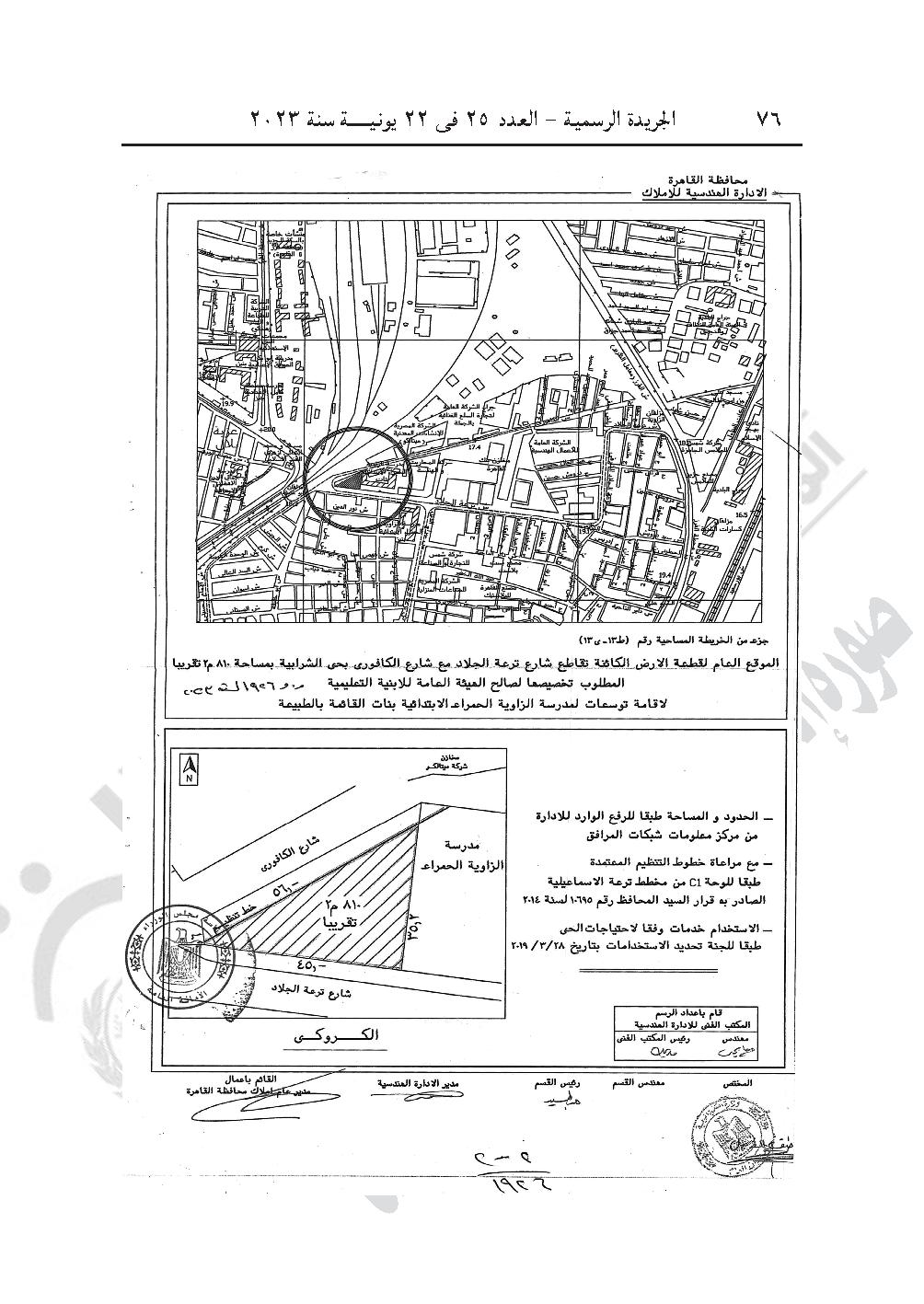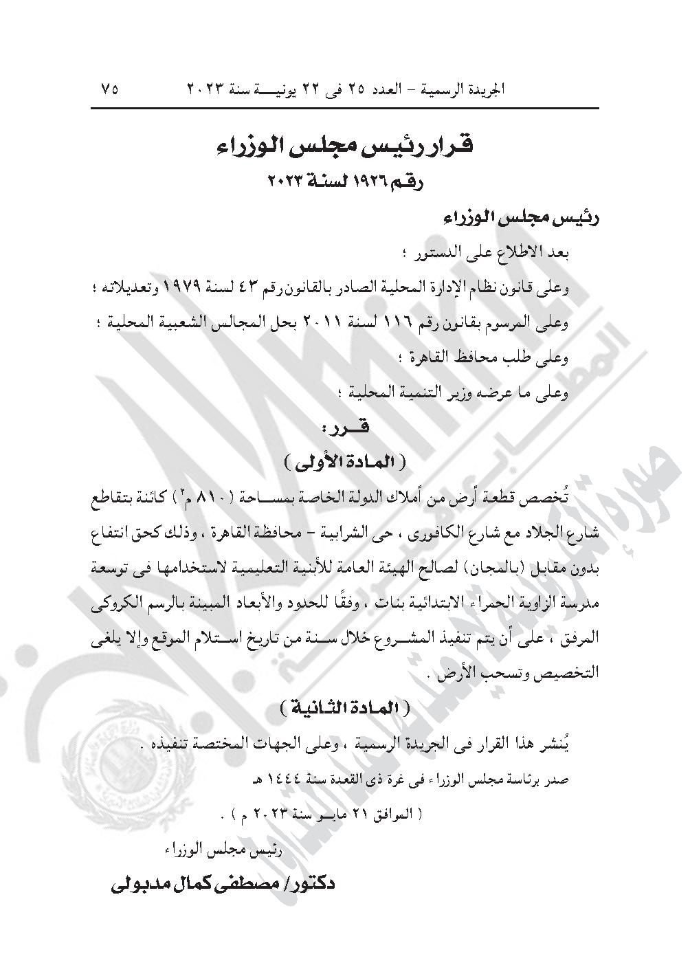 -قرار رئيس الوزراء رقم 1926 لسنة 2023، بتخصيص قطعة أرض من أملاك الدولة الخاصة بمساحة 810 أمتار مربعة، بالمجان، لصالح الهيئة العامة للأبنية التعليمية.