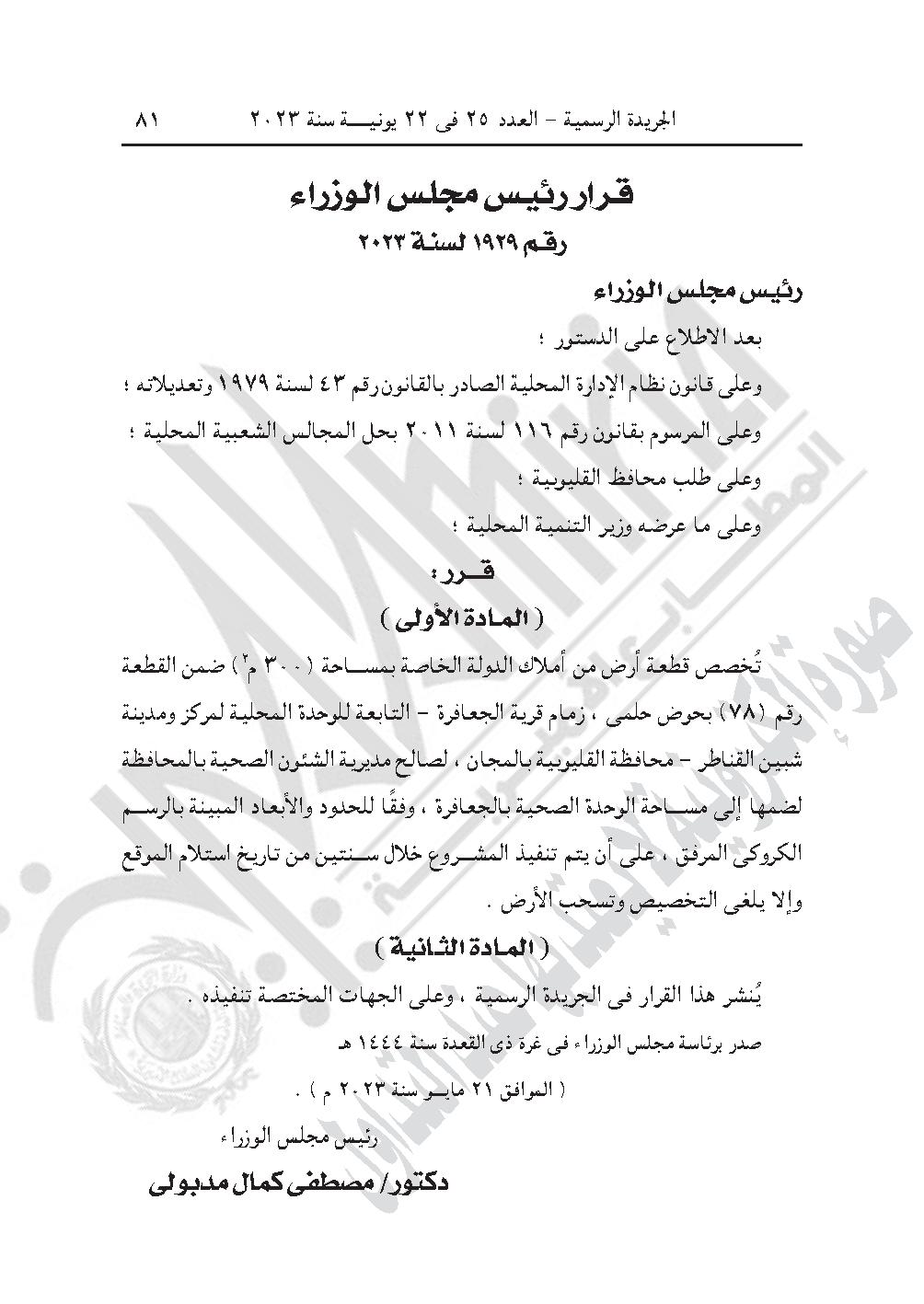 -قرار رئيس الوزراء رقم 1929 لسنة 2023، بتخصيص قطعة أرض من أملاك الدولة الخاصة بمساحة 300 متر مربع، بالمجان، لصالح مديرية الشئون الصحية بالمحافظة لضمها إلى مساحة الوحدة الصحية بالجعافرة.