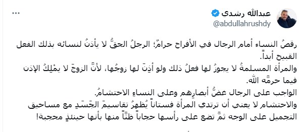 وعلق الداعية الإسلامي عبد الله رشدي، الذي دخل على أزمة صاحبة الفستان الأزرق، فقال: "رقصُ النساء أمام الرجال في الأفراح حرامٌ؛ الرجلُ الحقُّ لا يأذنُ لنسائه بذلك الفعل القبيح أبدًا. والمرأة المسلمةُ لا يجوزُ لها فعلُ ذلك ولو أذِنَ لها زوجُها، لأنَّ الزوجَ لا يمْلِكُ الإذن فيما حرمَّه الله."