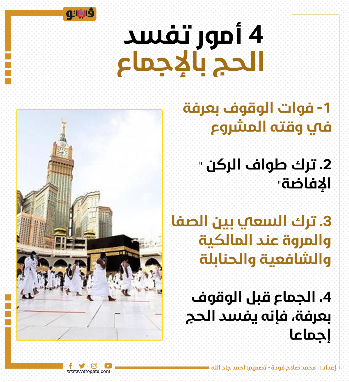 4 أمور تفسد الحج بالإجماع (انفوجراف) الخميس 22/يونيو/2023 - 05:13 م 6/22/2023 5:13:22 PM الحجاج، فيتو - محمد صلاح فودة شارك طباعة 18 حجم الخط شارك طباعة أحكام أداء مناسك الحج أحكام فريضة الحج مفسدات الحج أحكام صيام التسع من ذي الحجة
