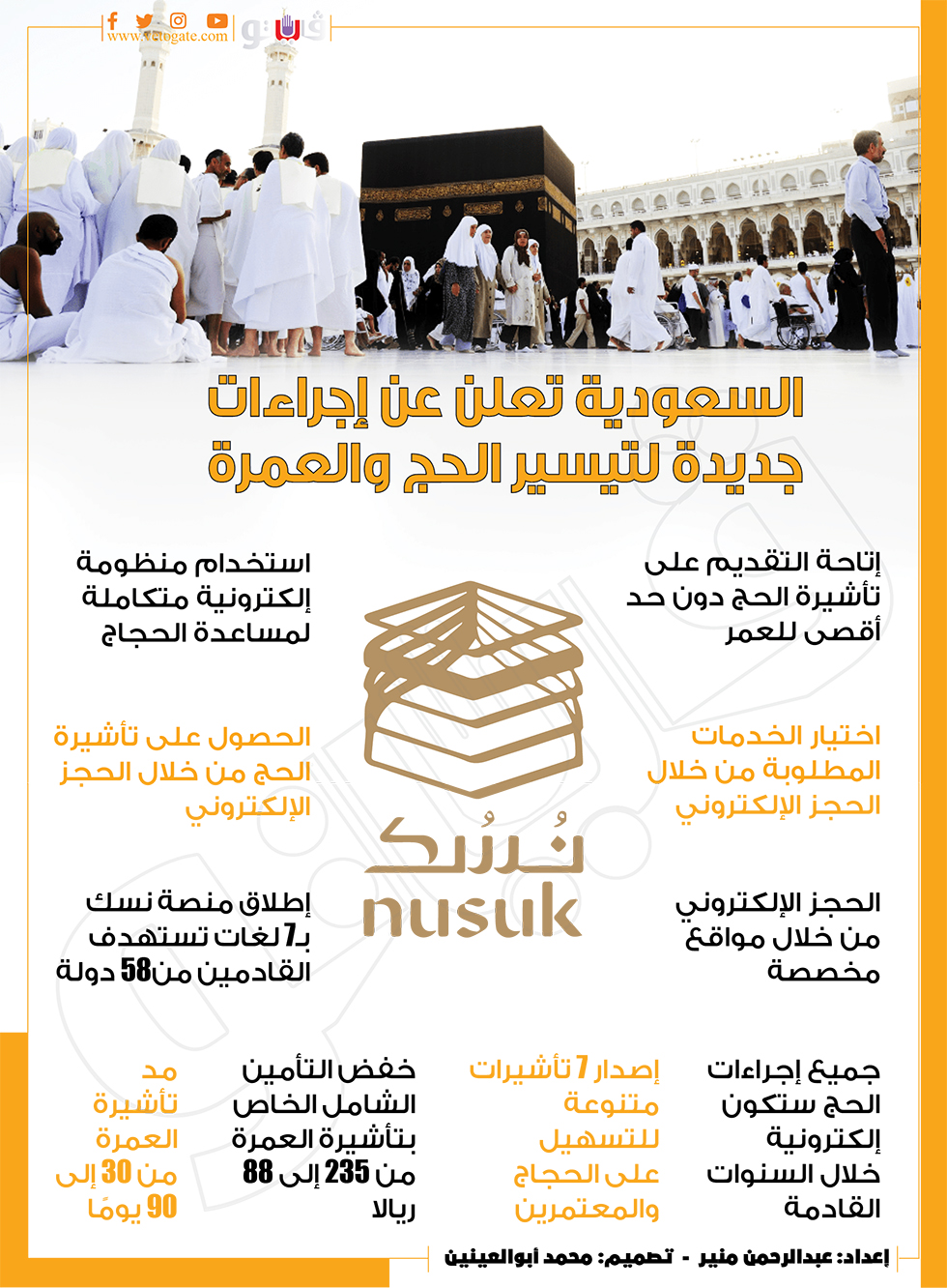 السعودية تعلن عن إجراءات جديدة لتيسير الحج والعمرة (إنفوجراف) الجمعة 23/يونيو/2023 - 03:29 م 6/23/2023 3:29:37 PM حجاج بيت الله الحرام، فيتو عبدالرحمن منير شارك طباعة 18 حجم الخط شارك طباعة موسم الحج 2023 الحج و العمرة السعودية تأشيرة الحج والعمرة