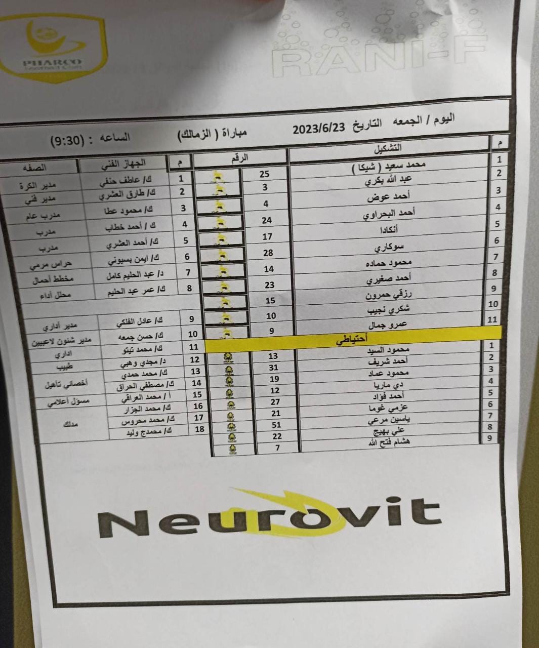 ويتواجد على مقاعد البدلاء كل من، محمد نديم وعمر جابر وعمرو السيسي ومحمد حسام بيسو ومحمد أشرف "روقا " وسيد عبد الله " نيمار" وأحمد بلحاج وسيف جعفر وناصر منسي.