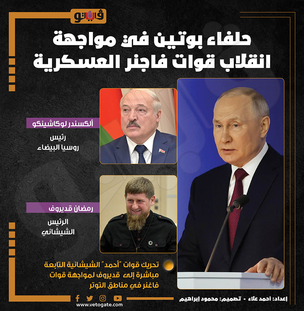 حلفاء بوتين في مواجهة انقلاب قوات فاجنر العسكرية (إنفوجراف) السبت 24/يونيو/2023 - 09:29 م 6/24/2023 9:29:26 PM بوتين وزعيم قوات فاجنر الروسية، فيتو احمد علاء شارك طباعة 18 حجم الخط شارك طباعة حلفاء بوتين قوات فاجنر العسكرية فاغنر الرئيس الشيشاني رمضان قديروف قوات فاغنر روسيا البيضاء الكسندر لوكاشينكو