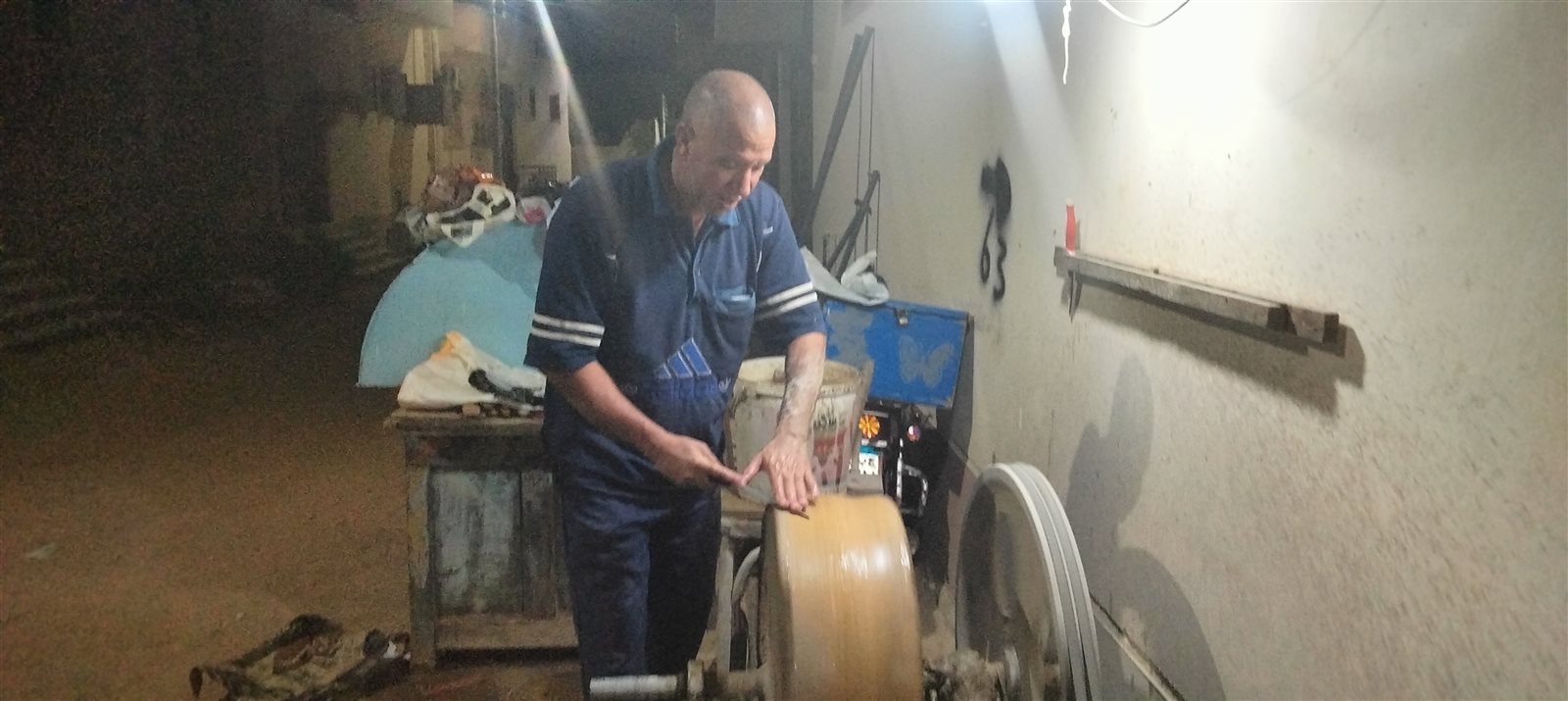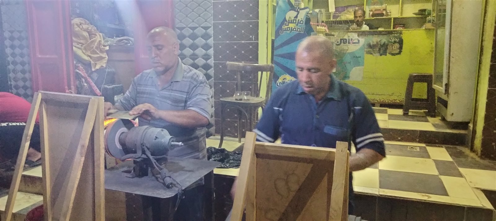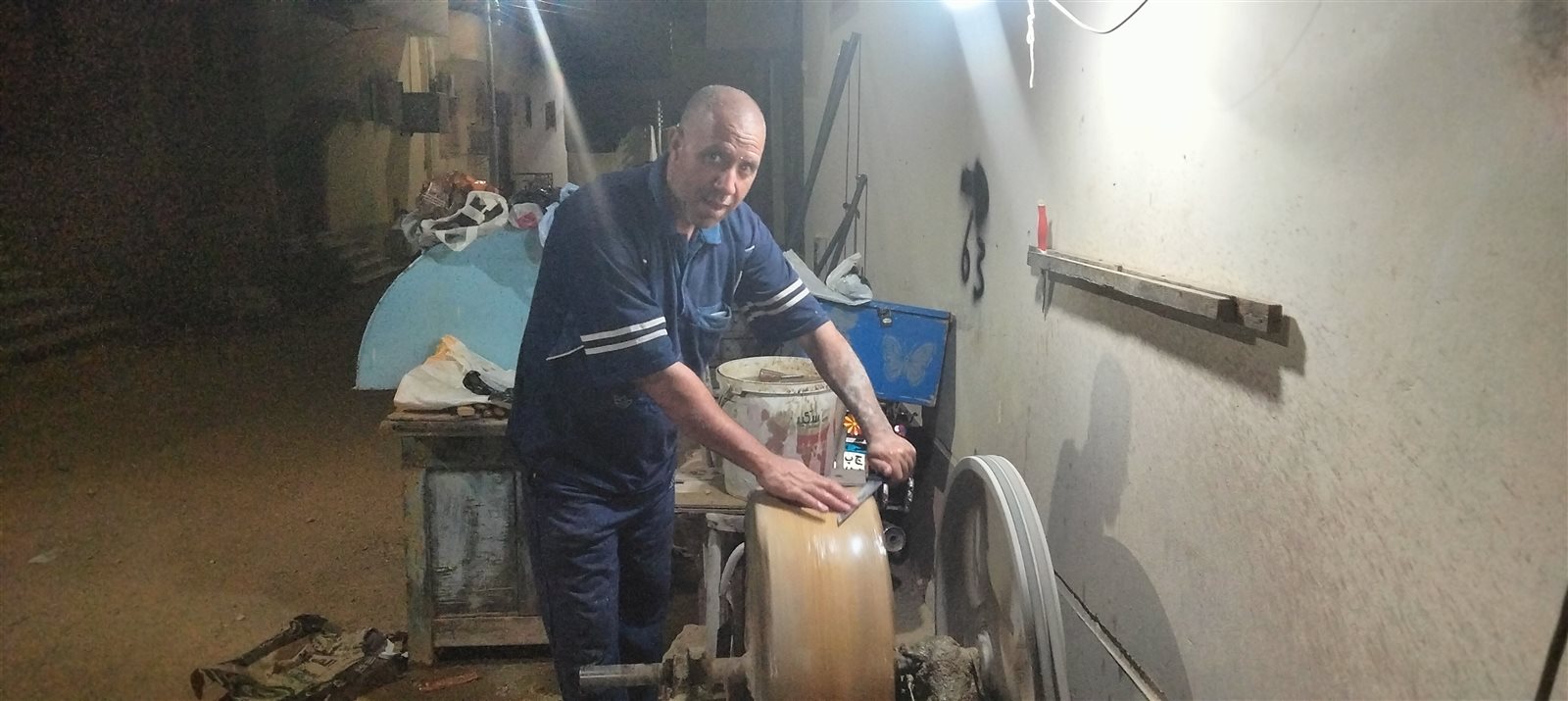 وما بين الحجر والحديد تتواجد يد العم كرم، وبجواره شقيقه صلاح، التى تظهر عليهما ملامح العمل منذ سنوات فى تلك الحرفة التى تقتصر على سن السكاكين والآلات المستخدمة فى التقطيع محافظًا على العمل اليدوى الذى أدخل عليه الكهرباء فقط.