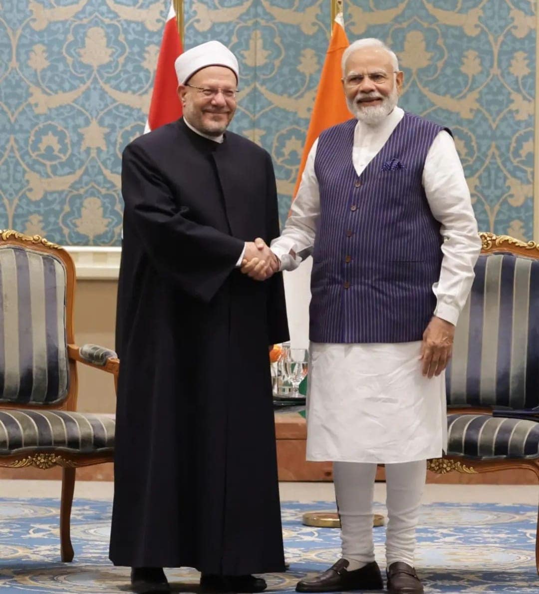 جاء ذلك خلال استقبال سيادته لفضيلة المفتي في مقر إقامته بالقاهرة في مستهل زيارته الرسمية للقاهرة، حيث وجَّه فضيلة المفتي الشكر لمعالي رئيس الوزراء الهندي على زيارته لمصر بعد زيارة فخامة الرئيس السيسي للهند.