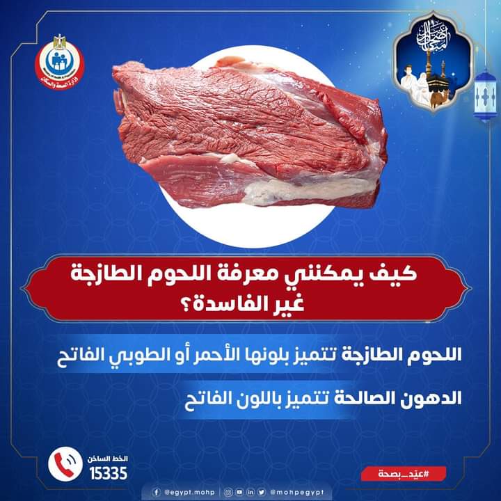 فيما أكدت وزارة الصحة تشديد الرقابة على العاملين بمحلات بيع اللحوم والطيور المذبوحة والمجمدة وعلى منافذ بيع اللحوم المصنعة والمجمدة ومحلات الجزارة، والتأكد من استيفائهم للاشتراطات الصحية والتزامهم بالممارسات الصحية أثناء تداول اللحوم والتأكد من أنهم يحملون شهادات صحية تثبت خلوهم من الأمراض المعدية، والتزامهم بالإجراءات الوقائية، لافتًة إلى المرور على سلاسل السوبر ماركت، ومخازن ومصانع اللحوم، فضلًا عن ثلاجات حفظ اللحوم والأسماك المجمدة وفحصها والتأكد من صلاحيتها واحتفاظها بخواصها الطبيعية وخلوها من علامات التلف، وضبط غير الصالح منها، بالإضافة إلى تكثيف الرقابة على الفنادق والمطاعم التي تقدم الوجبات خلال أيام العيد حرصًا على صحة وسلامة المواطنين.