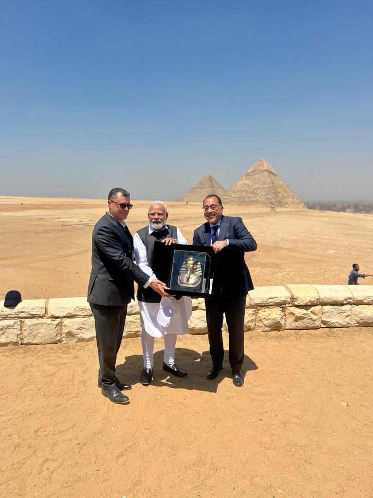 وفي ختام الجولة أهدى رئيس الوزراء وأحمد عيسى، وزير السياحة والآثار، إلى الضيف الهندي الكبير، مستنسخًا لقناع توت عنخ آمون، كتذكار يعبر عن الحضارة الفرعونية القديمة.