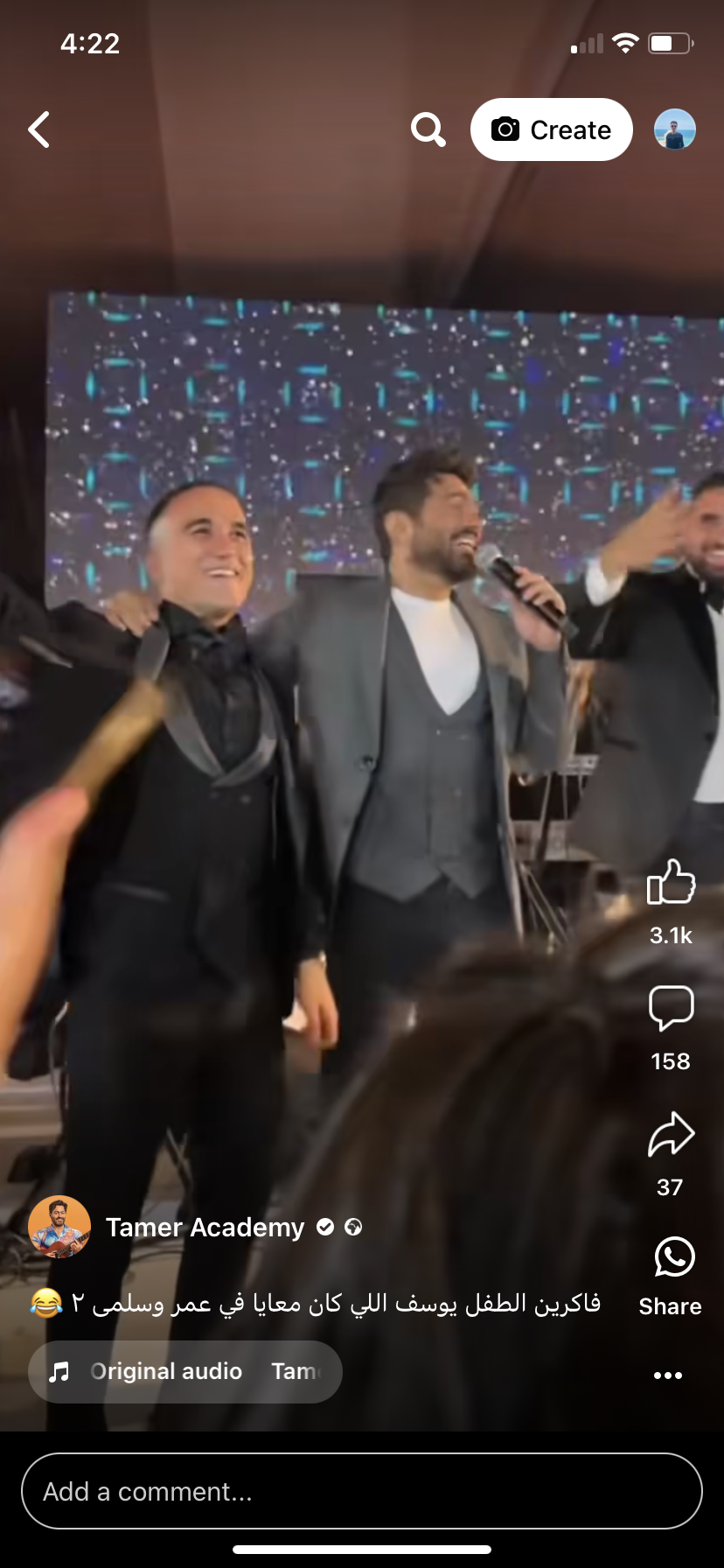 وقال تامر حسني من خلال الفيديو: “فاكرين فيلم عمر وسلمي 2 فاكرين يوسف اللي بقوله يا طفل يا سئيل كبر أهو”، وسط تفاعل الحضور.