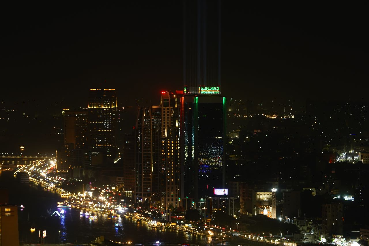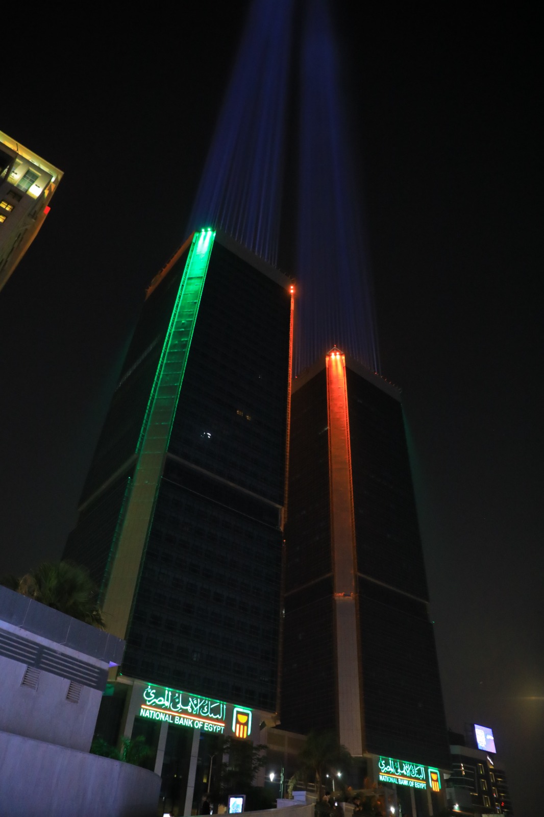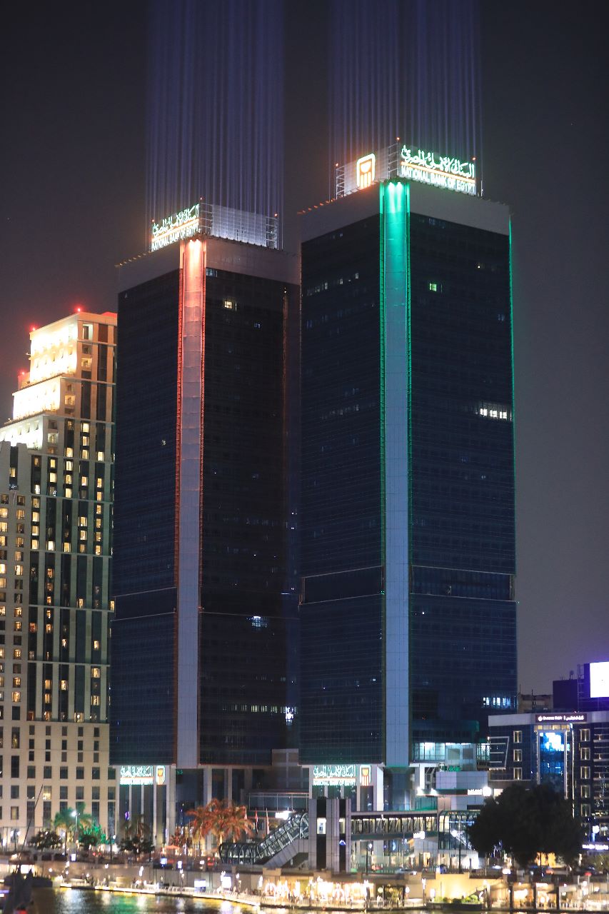 زين البنك الأهلي المصري أبراج المركز الرئيسي على كورنيش النيل بإضاءات مميزة مساء الأحد.