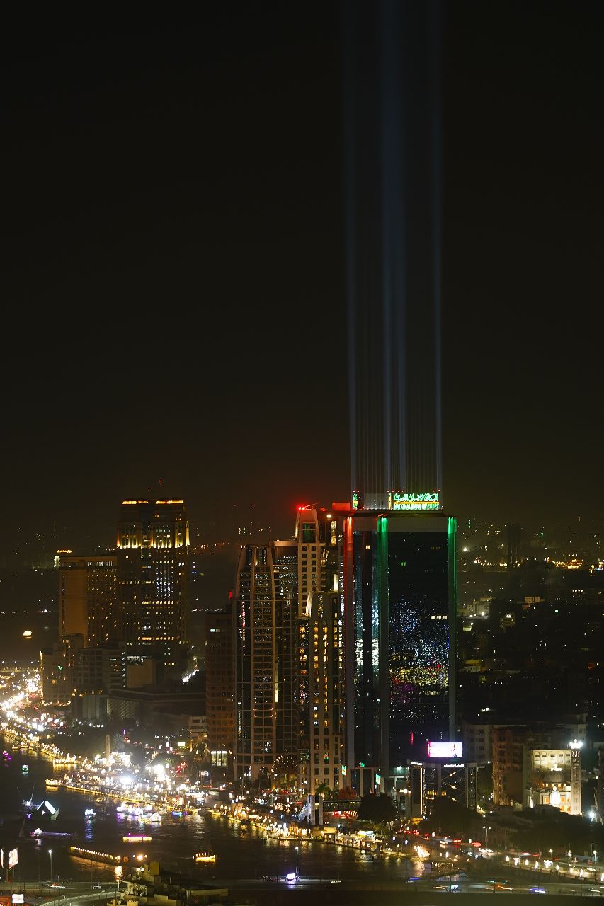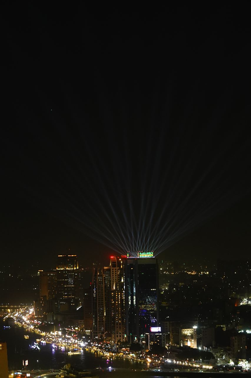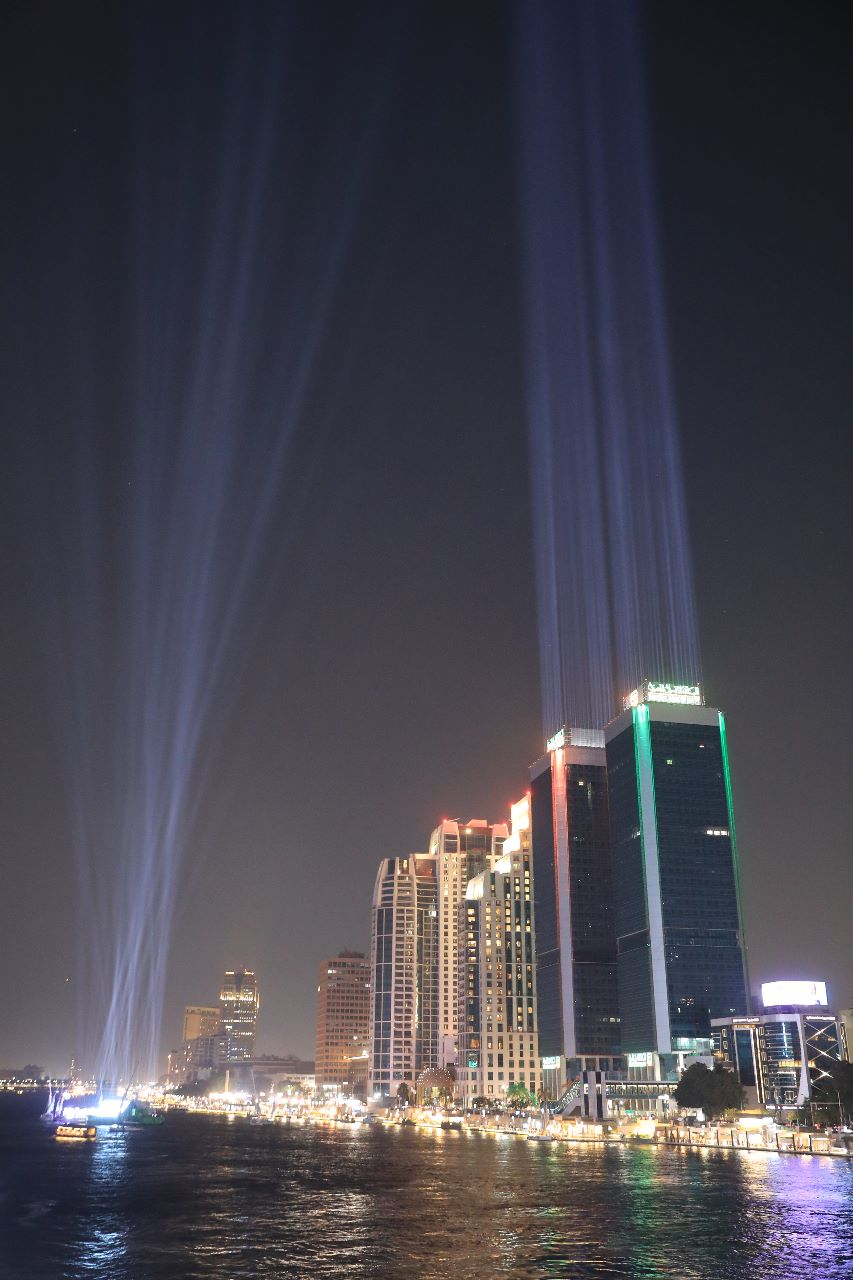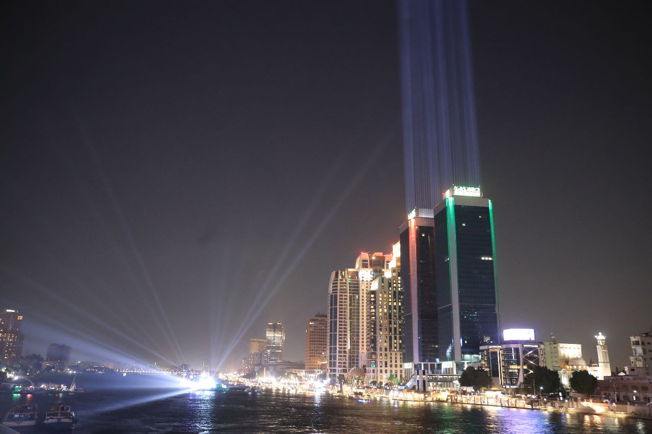 زين البنك الأهلي المصري أبراج المركز الرئيسي على كورنيش النيل بإضاءات مميزة مساء الأحد.