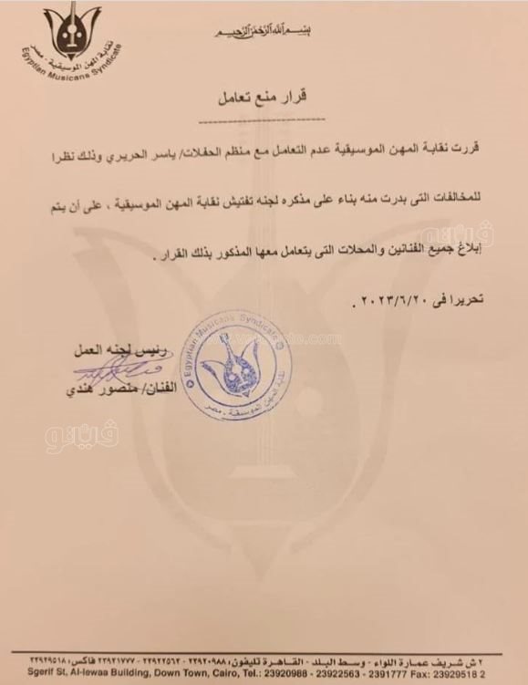 في هذا السياق، حصلت “فيتو”، على صورة من القرار الذى أصدره الفنان مصطفي كامل، ضد منظم الحفلات الشهير، والذى قرر فيها منع “الحريري” من التعامل مع النقابة، بخلاف إبلاغ كافة الجهات الفنية، التى يتعامل معها، وجميع الفنانين، بإيقاف التعامل معه، لعدم التعرض للعقوبة القانونية من النقابة.