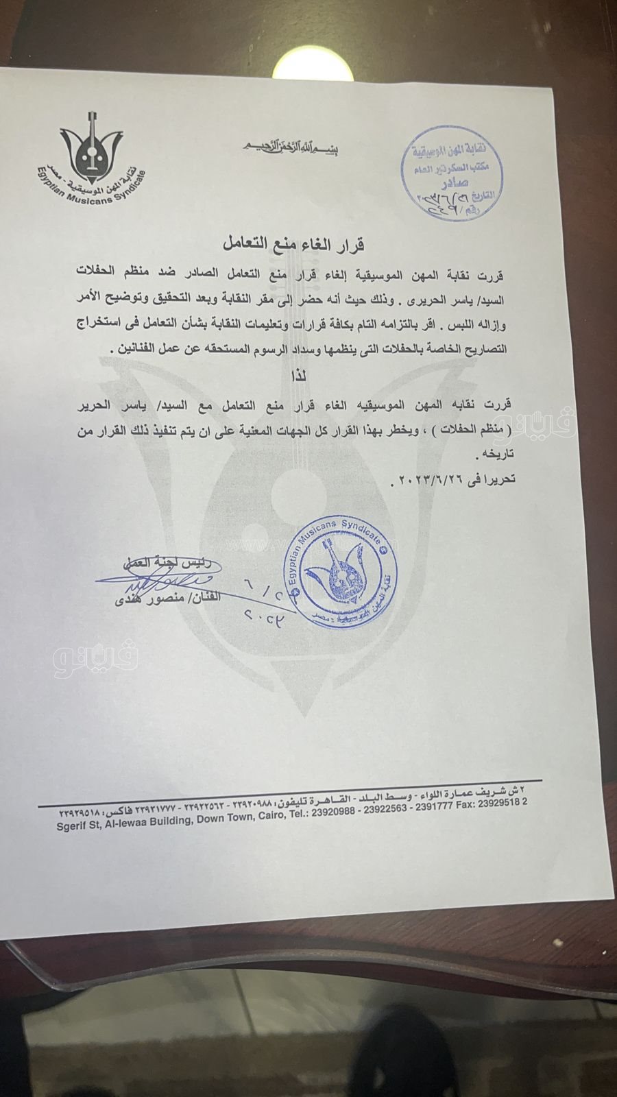 وكانت “فيتو”، حصلت على صورة من القرار الذى أصدره الفنان مصطفي كامل، ضد منظم الحفلات الشهير، والذى قرر فيها منع “الحريري” من التعامل مع النقابة، بخلاف إبلاغ كافة الجهات الفنية، التى يتعامل معها، وجميع الفنانين، بإيقاف التعامل معه، لعدم التعرض للعقوبة القانونية من النقابة.