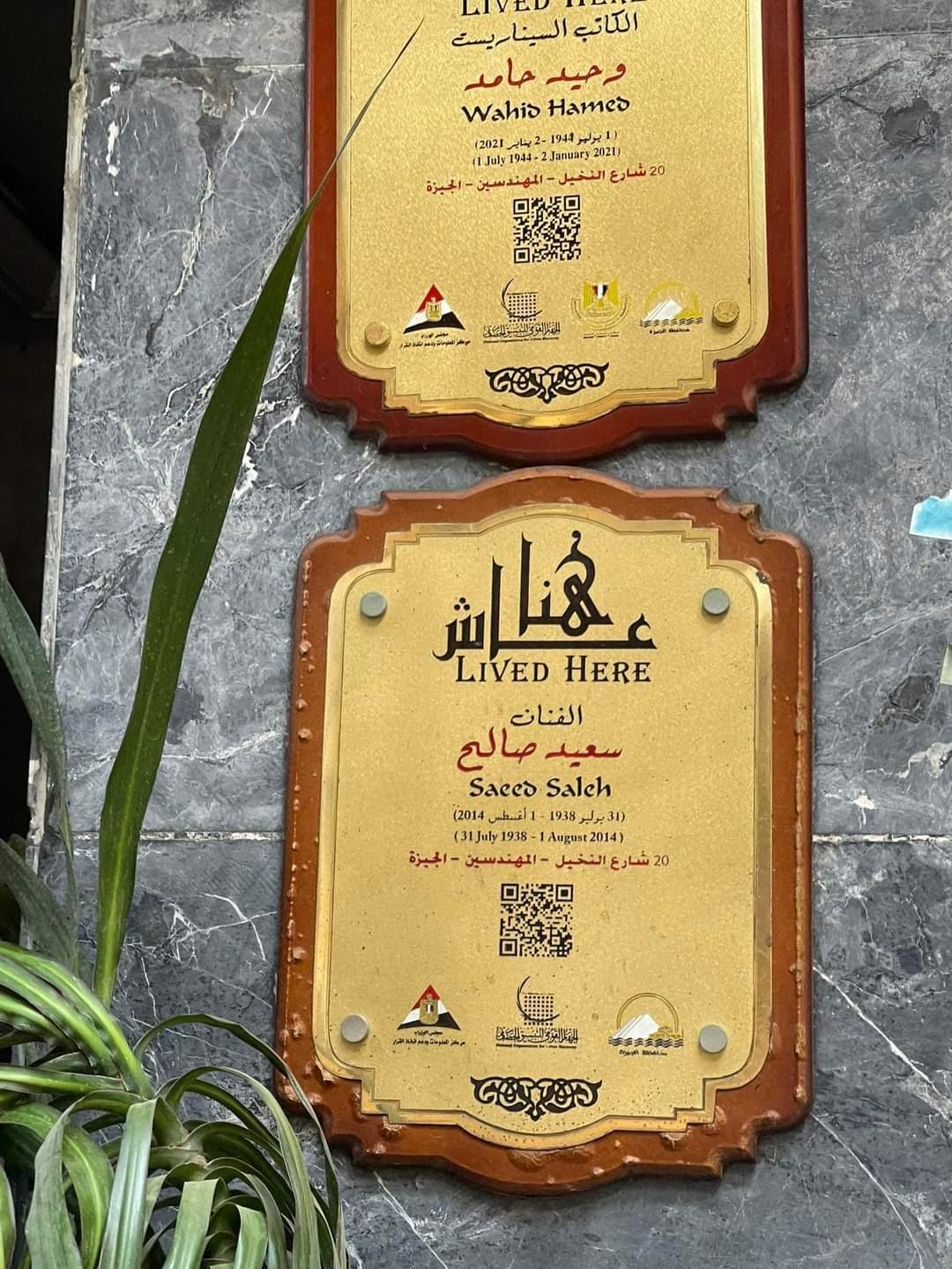 أدرج الجهاز القومي للتنسيق الحضاري لافتة "عاش هنا" للفنان الراحل سعيد صالح والمؤلف والسينارست العملاق وحيد حامد على منزل مقام بالمهندسين محل سكنهما.