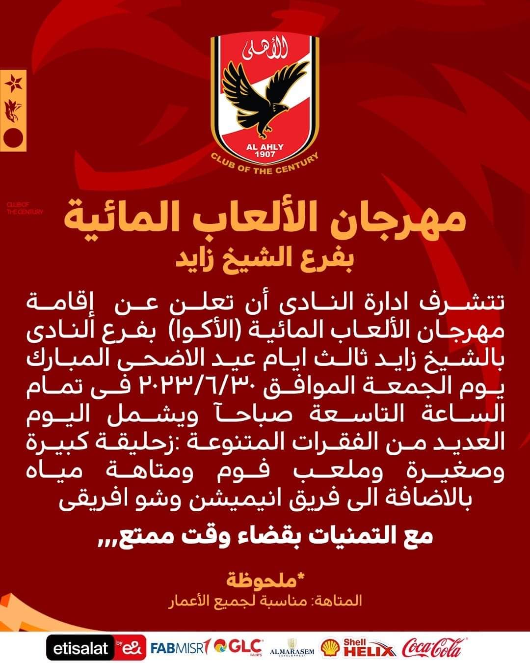 الأهلى أمام البنك،يستعد النادي الأهلي لاقامة العديد من الاحتفالات المختلفة والمتنوعة داخل مقره الرئيسي بالجزيرة وفروعه في مدينة نصر والشيخ زايد والتجمع الخامس تزامنا مع عيد الأضحى المبارك.