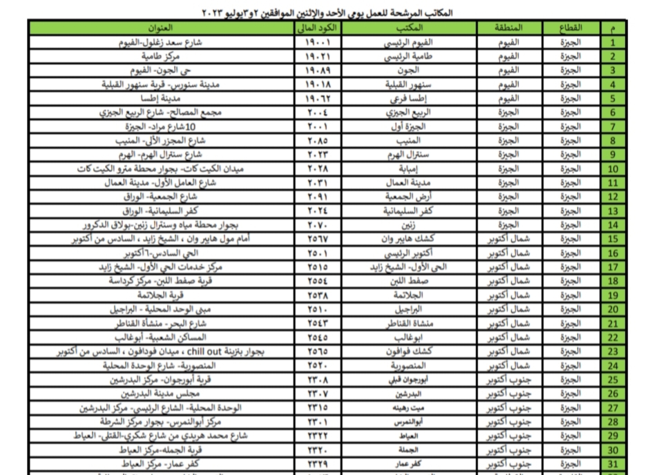 بعد قيام الهيئة القومية للبريد بإعلان مواعيد العمل بمكاتب البريد خلال إجازة عيد الأضحى المبارك، ننشر خلال السطور التالية عناوين مكاتب البريد بمحافظة الجيزة العاملة خلال إجازة عيد الأضحى يومي الأحد والإثنين الموافقين ٢ و٣ يوليو، على أن يتم استئناف العمل بجميع مكاتب البريد بكامل طاقتها بدءًا من يوم الثلاثاء الموافق ٤ يوليو.