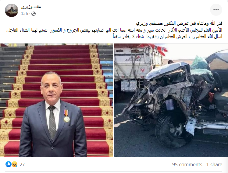 وكتبت: قدر الله وما شاء فعل.. تعرض الدكتور مصطفى وزيري، الأمين العام للمجلس الأعلى للآثار، لحادث سير ومعه ابنته، مما أدى إلى إصابتهم ببعض الجروح والكسور.. نتمنى لهما الشفاء العاجل، أسأل الله العظيم رب العرش العظيم أن يشفيهما شفاء لا يغادر سقمًا".