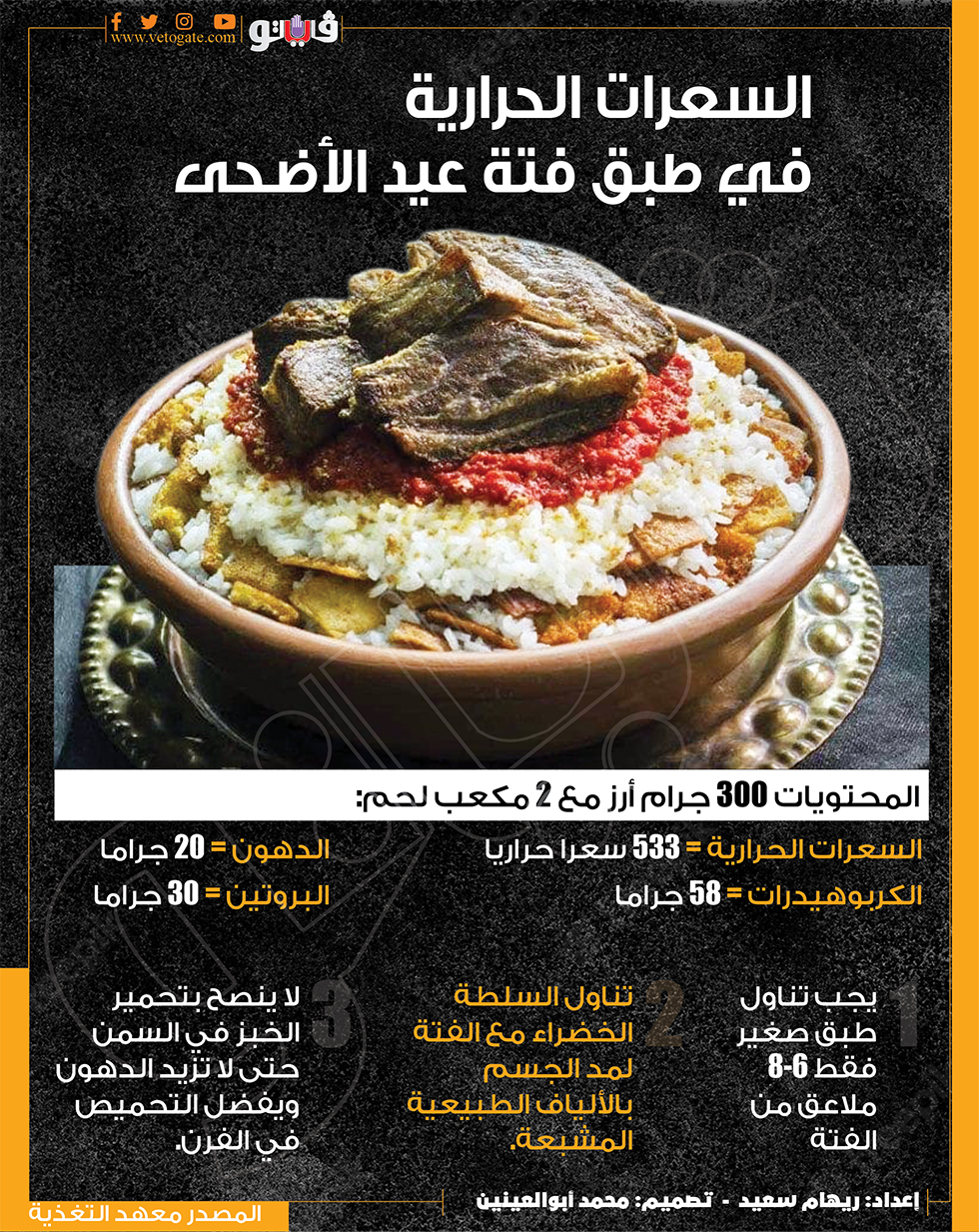 أكد معهد التغذية أنه يجب تناول طبق صغير فقط ٦-٨ ملاعق من الفتة تناول السلطة الخضراء مع الفتة لمد الجسم بالألياف الطبيعية المشبعة ولا ينصح بتحمير الخبز في السمن البلدي حتى لا تزيد الدهون ويفضل التحميص في الفرن.