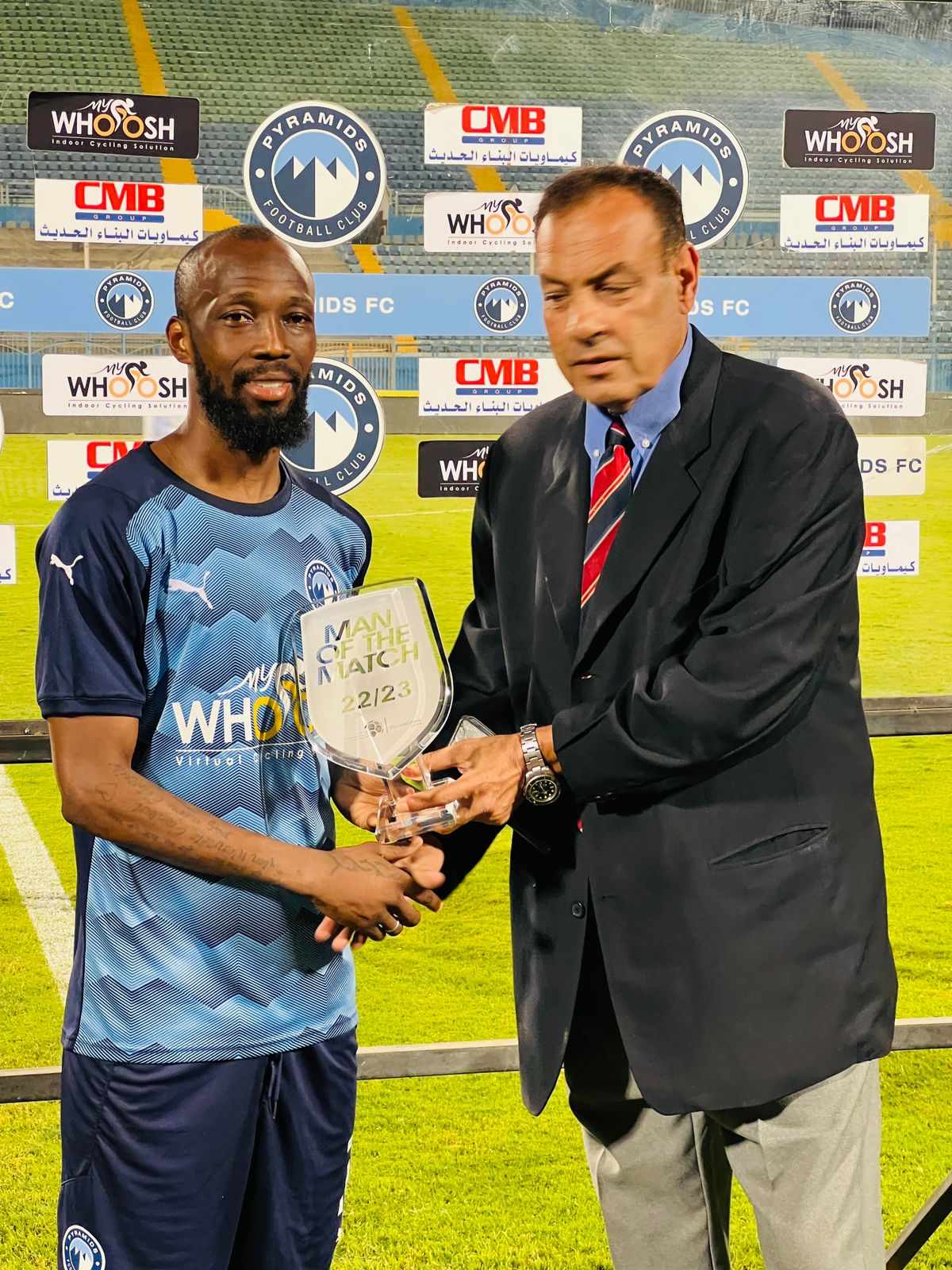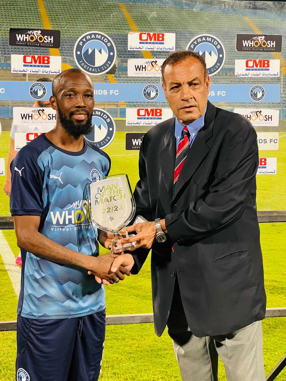 قدم فريق نادي بيراميدز قميصًا تذكاريًّا للنجم مؤمن زكريا مدرب فريق نادي سموحة قبل مباراة الفريقين في الدوري الممتاز.