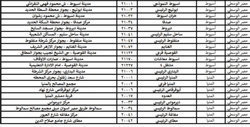 بعد قيام الهيئة القومية للبريد بإعلان مواعيد العمل بمكاتب البريد خلال إجازة عيد الأضحى المبارك، ننشر خلال السطور التالية عناوين مكاتب البريد بمحافظات مصر الوسطى العاملة خلال إجازة عيد الأضحى يومي الأحد والإثنين الموافقين ٢ و٣ يوليو، على أن يتم استئناف العمل بجميع مكاتب البريد بكامل طاقتها بدءًا من يوم الثلاثاء الموافق ٤ يوليو.