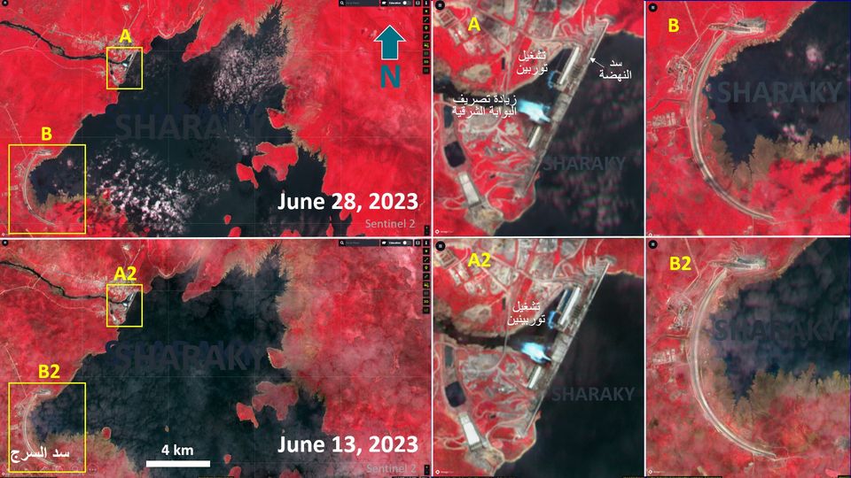 وتابع: "تظهر الصور الفضائية ليوم الأربعاء 28 يونيو 2023 زيادة طفيفة في مخزون سد النهضة، بالإضافة إلى تشغيل توربين واحد، ويتضح ذلك من خلال ضعف الدوامات في حوض الاستقبال، مع زيادة المنصرف من بوابة التصريف الشرقية قليلًا عن الأسابيع الماضية بمعدل حوالي 30 - 35 مليون م3/يوم، ولو أن التوربينين يعملان 12 ساعة يوميًا لأمكنهما إمرار 100 مليون م3/يوم، وهذا كان كافيًا فى أشهر الجفاف الماضية، وحينئذ لا داع لفتح بوابة التصريف الشرقية التى تهدر المياه بالنسبة لإثيوبيا لعدم مرورها على التوربينات".