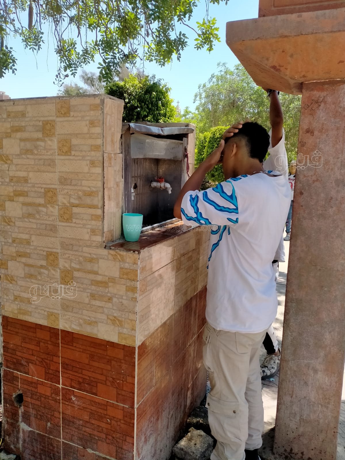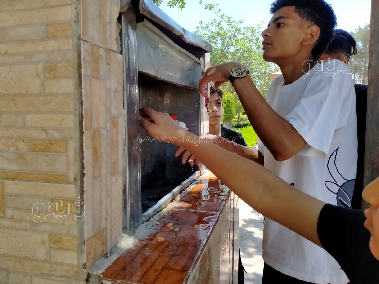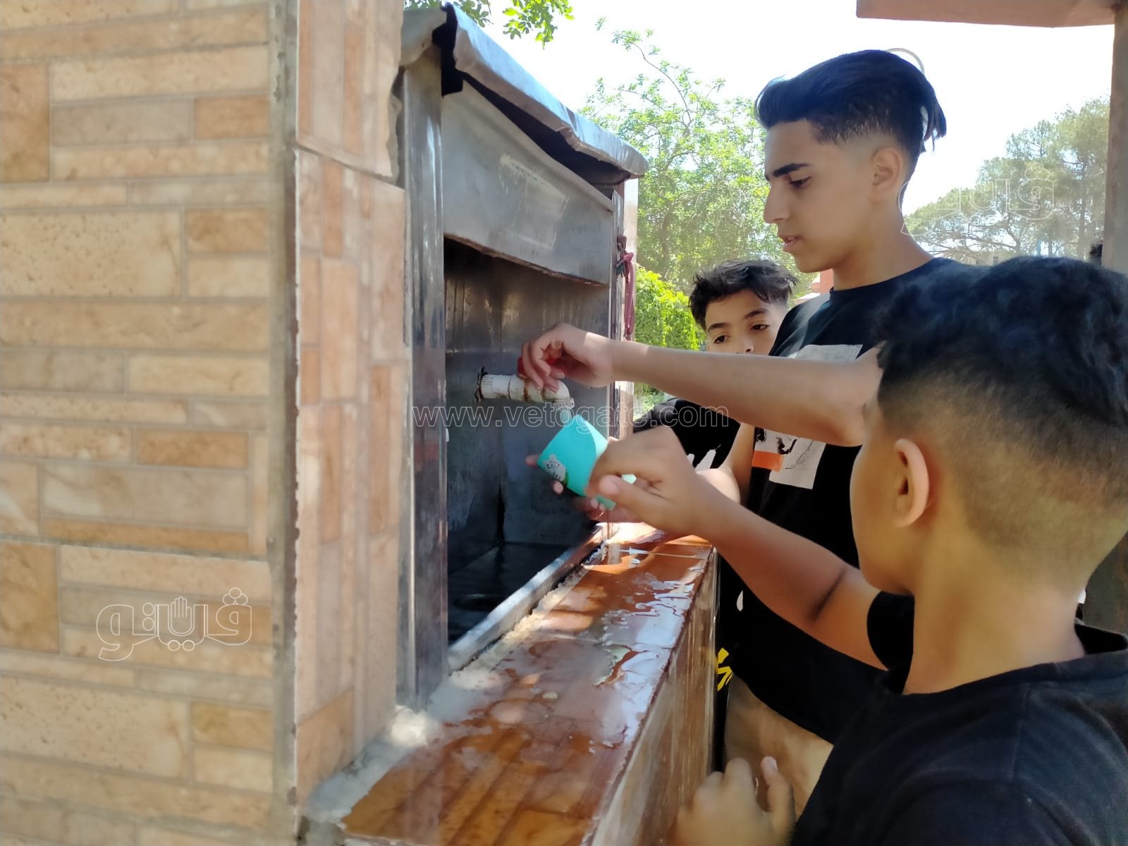 يحرص زوار الحديقة اليابانية على شرب المياه الباردة التي توفرها الحديقة في أماكن مختلفة مع ارتفاع درجات الحرارة.