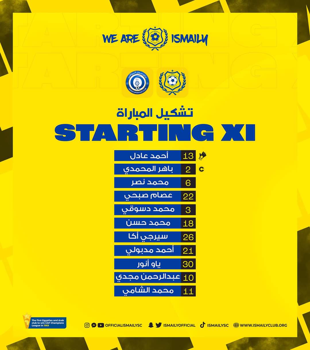 ويضم تشكيل الاسماعيلي، أحمد عادل عبد المنعم في حراسة المرمى وباهر المحمدي ومحمد نصر وعصام صبحي ومحمد دسوقي ومحمد حسن وسيرجي أكا وأحمد مدبولي وياو أنور وعبدالرحمن مجدي ومحمد الشامي.